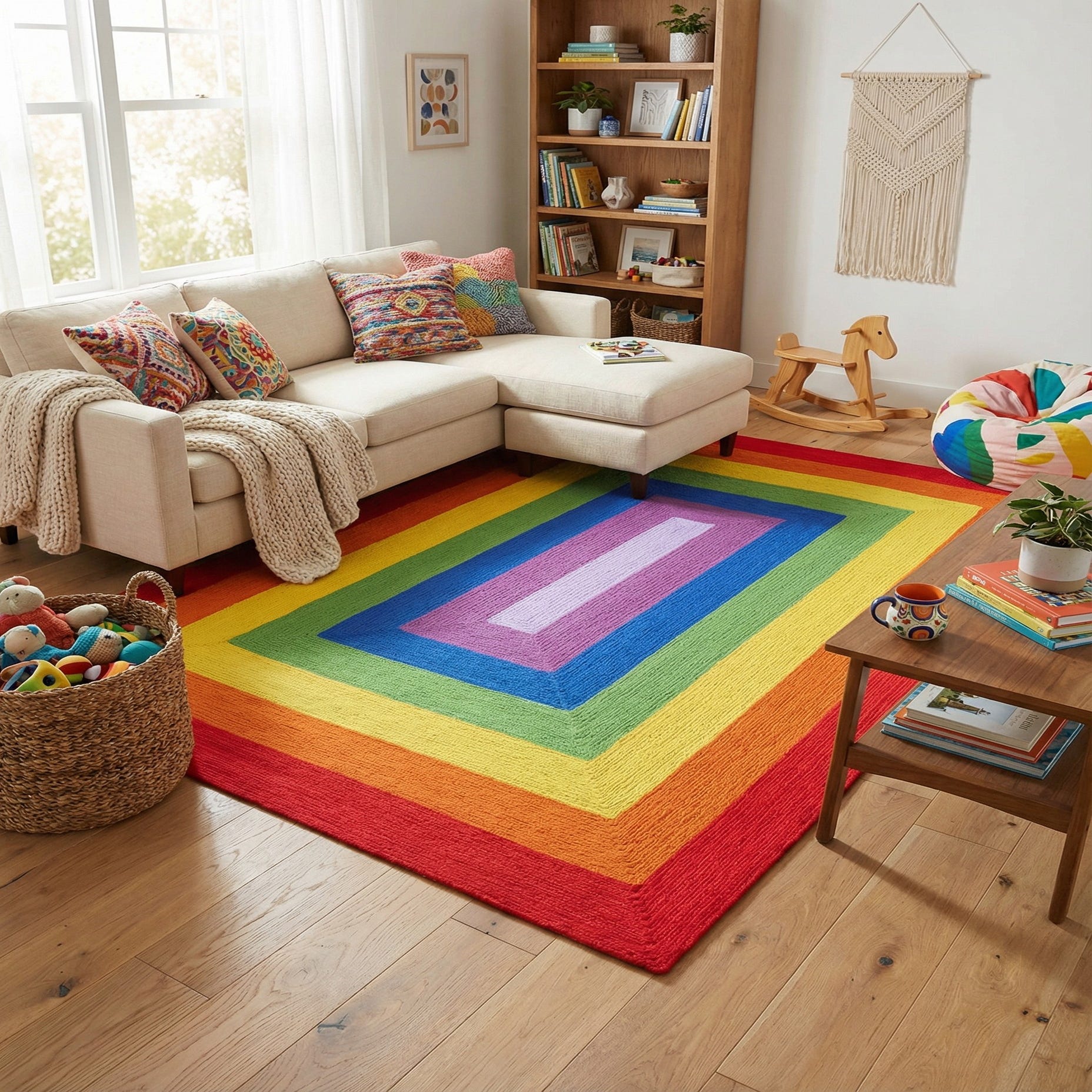 Primary color is Multi. Colors in this rug include: Multi, Blue, Green, Orange, Red, Purple, Yellow, Violet.