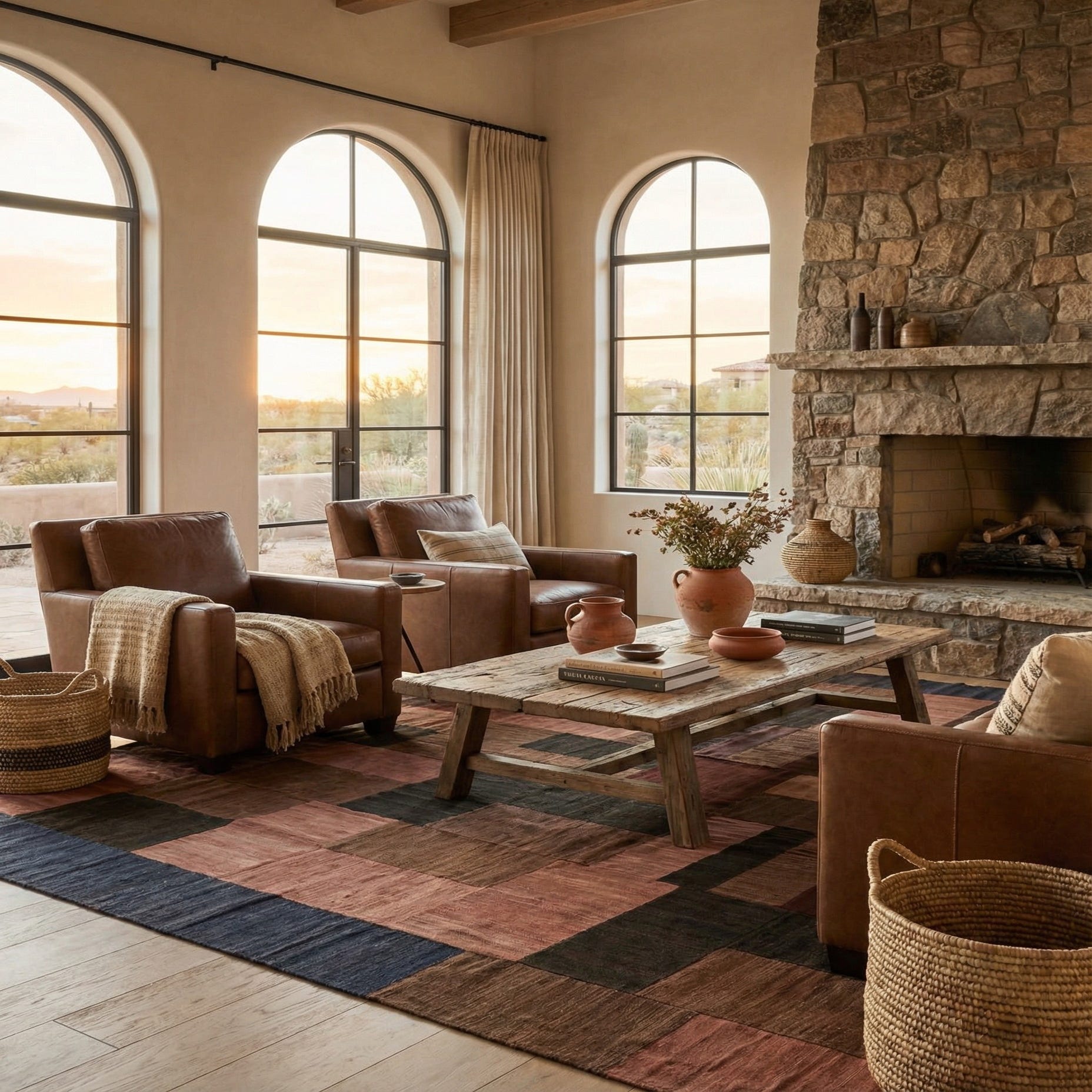 Primary color is Multi. Colors in this rug include: Multi, Brown, Light Brown, Maroon, Navy Blue, Olive, Rust Red.