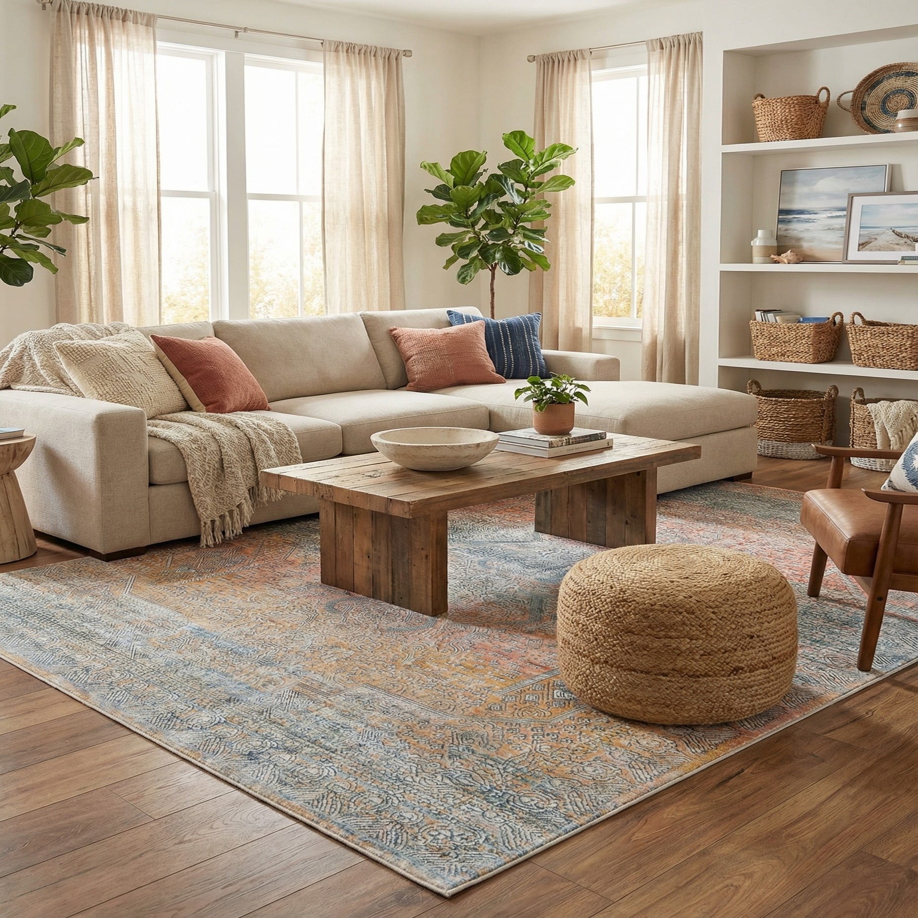 Primary color is Multi. Colors in this rug include: Multi, Ivory, Light Blue, Light Salmon, Rust Red, Terracotta.