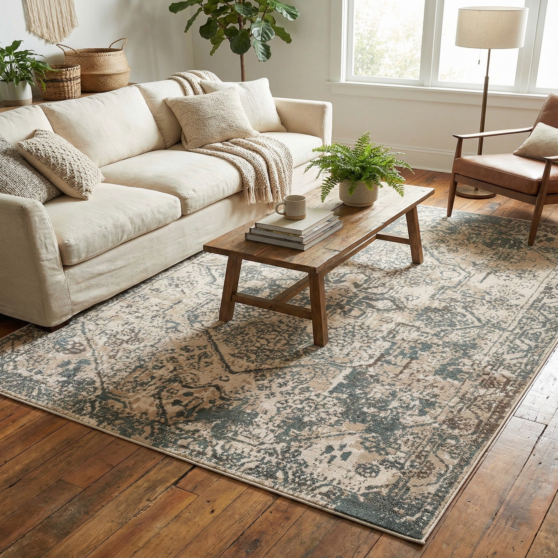 Primary color is Multi. Colors in this rug include: Multi, Brown, Gray, Teal, Tan, Cream.