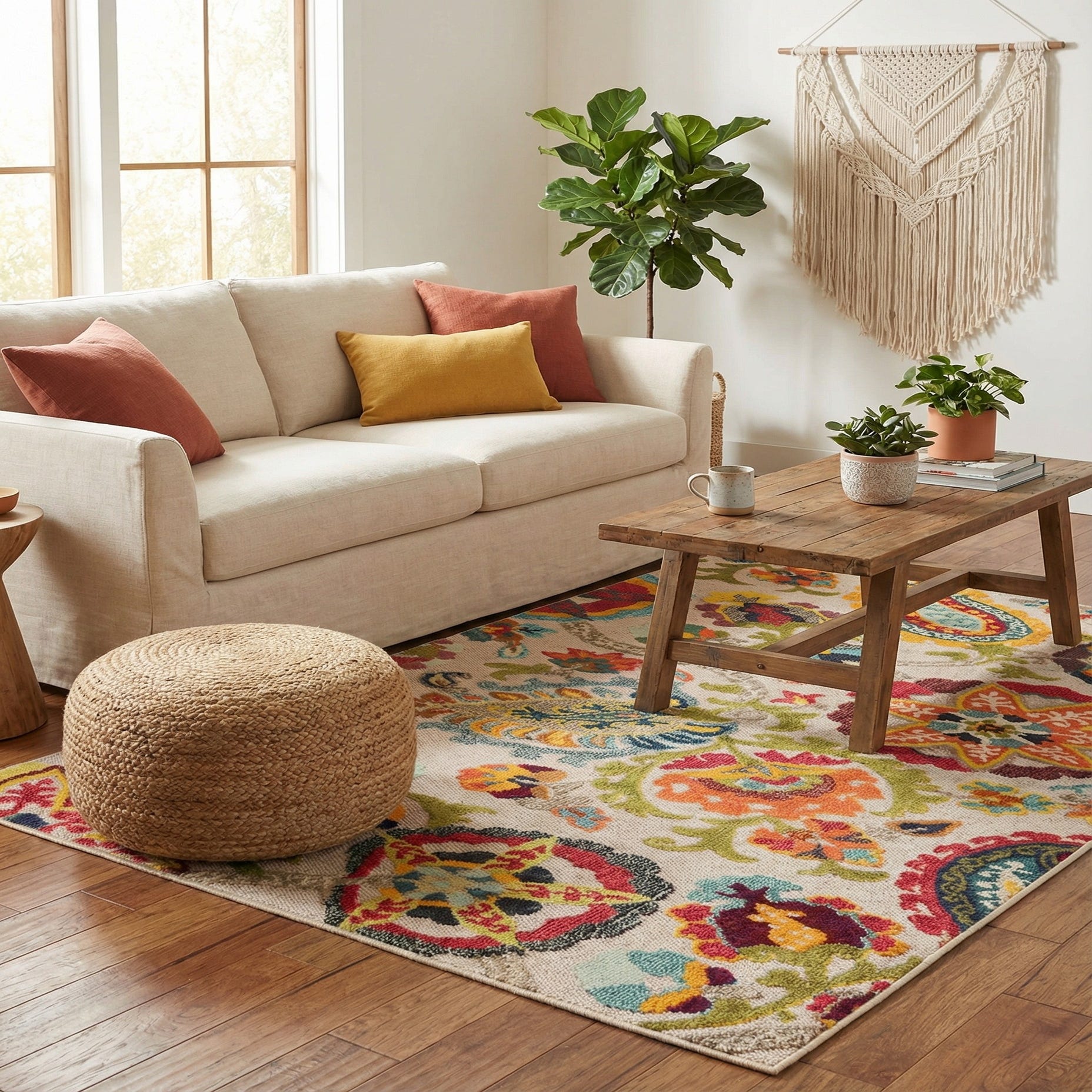 Primary color is Multi Beige. Colors in this rug include: Multi Beige, Beige, Black, Blue, Burgundy, Green, Hunter Green, Ivory, Red, Yellow, Olive, Orange.