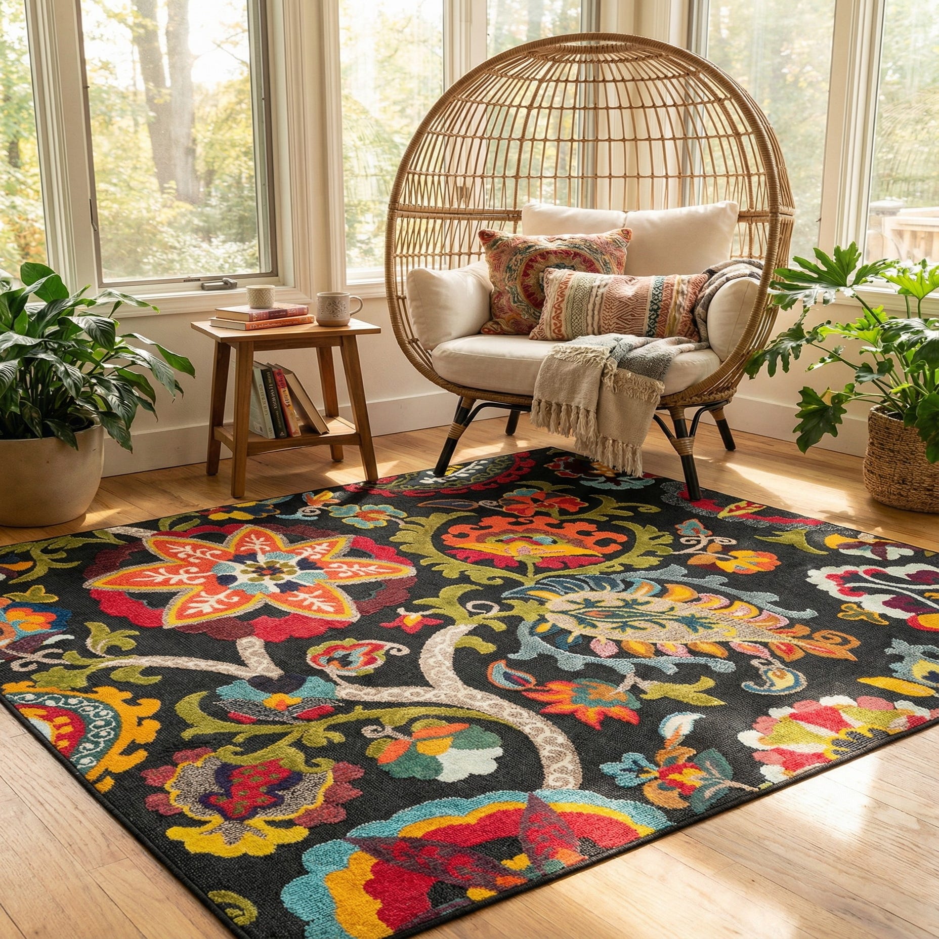 Primary color is Multi Black. Colors in this rug include: Multi Black, Beige, Blue, Burgundy, Ivory, Red, Olive, Orange, Yellow, Hunter Green.