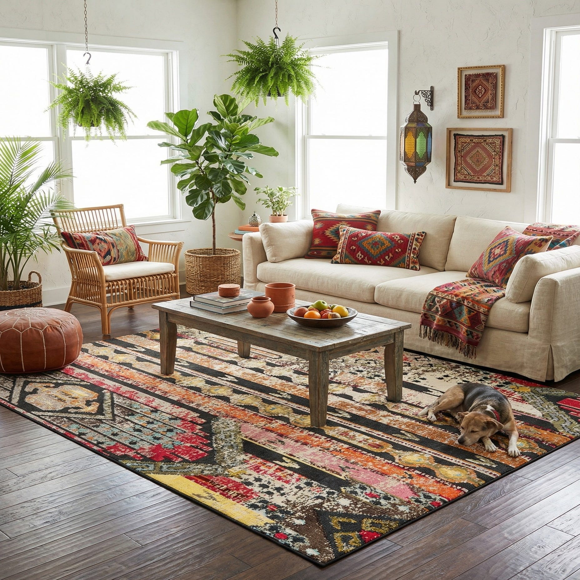 Primary color is Multi Black. Colors in this rug include: Multi Black, Beige, Blue, Green, Ivory, Light Brown, Orange, Red, Yellow.