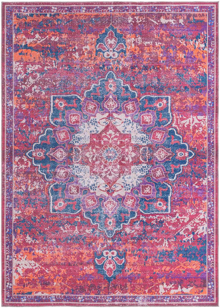 Primary color is Multi Fuchsia. Colors in this rug include: Multi Fuchsia, Ivory, Red, Navy Blue, Orange, Violet.