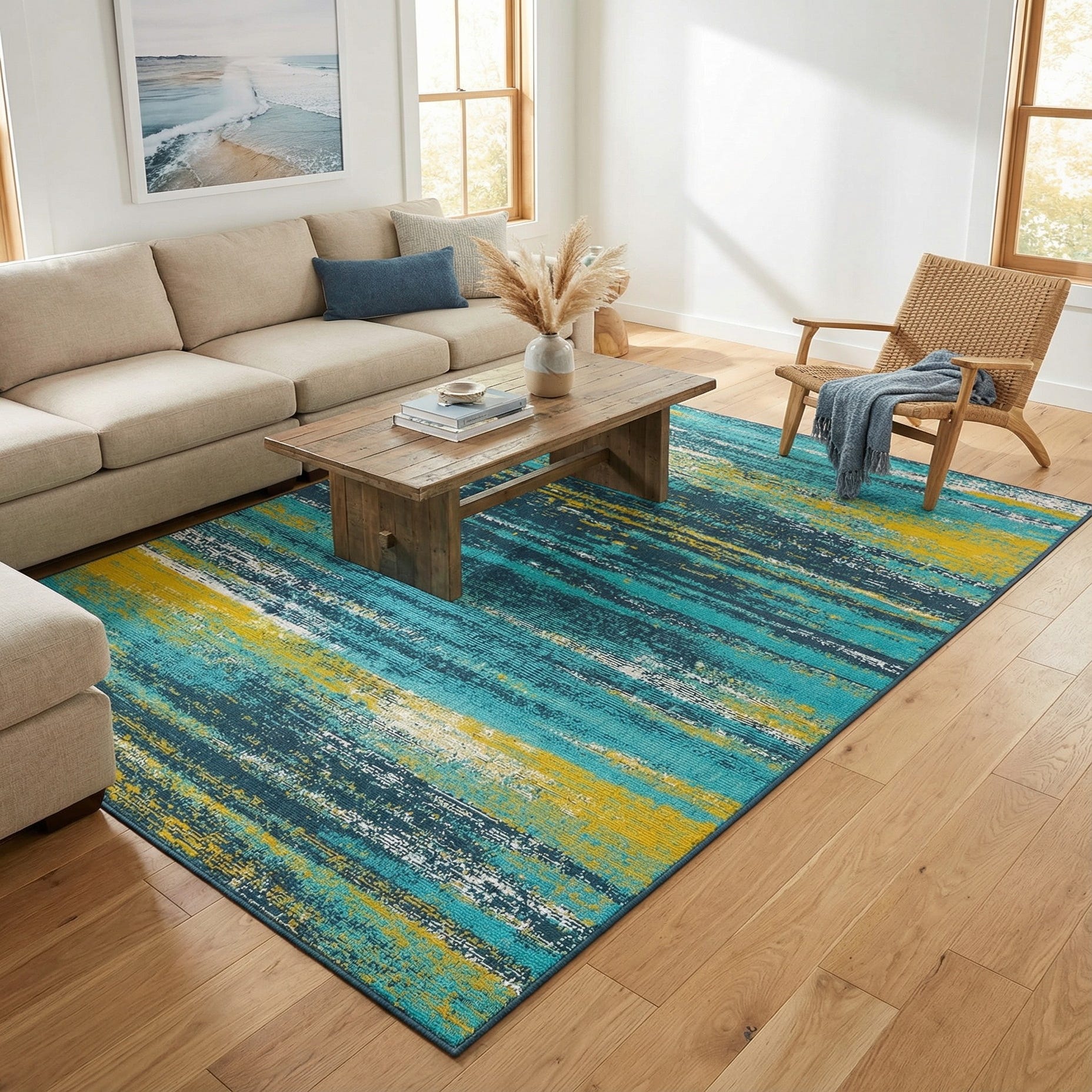 Primary color is Multi.Blue. Colors in this rug include: Multi.Blue, Ivory, Teal, Yellow.