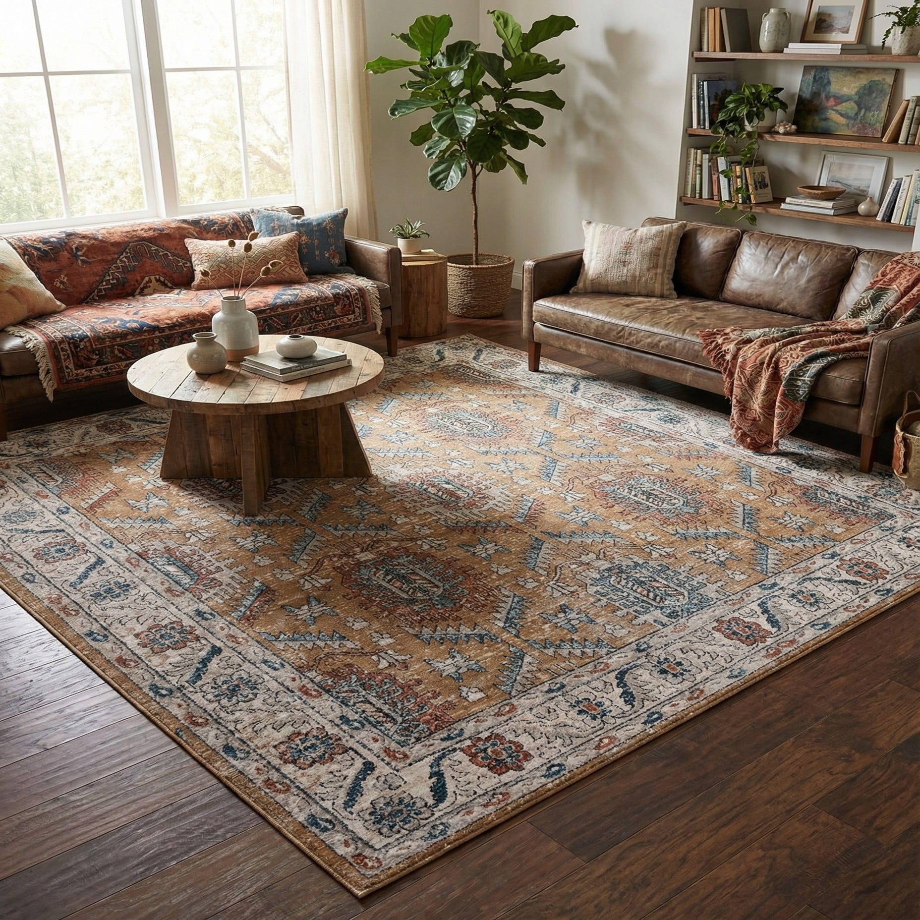 Primary color is Mustard Yellow. Colors in this rug include: Mustard Yellow, Black, Blue, Gray, Ivory, Rust Red.