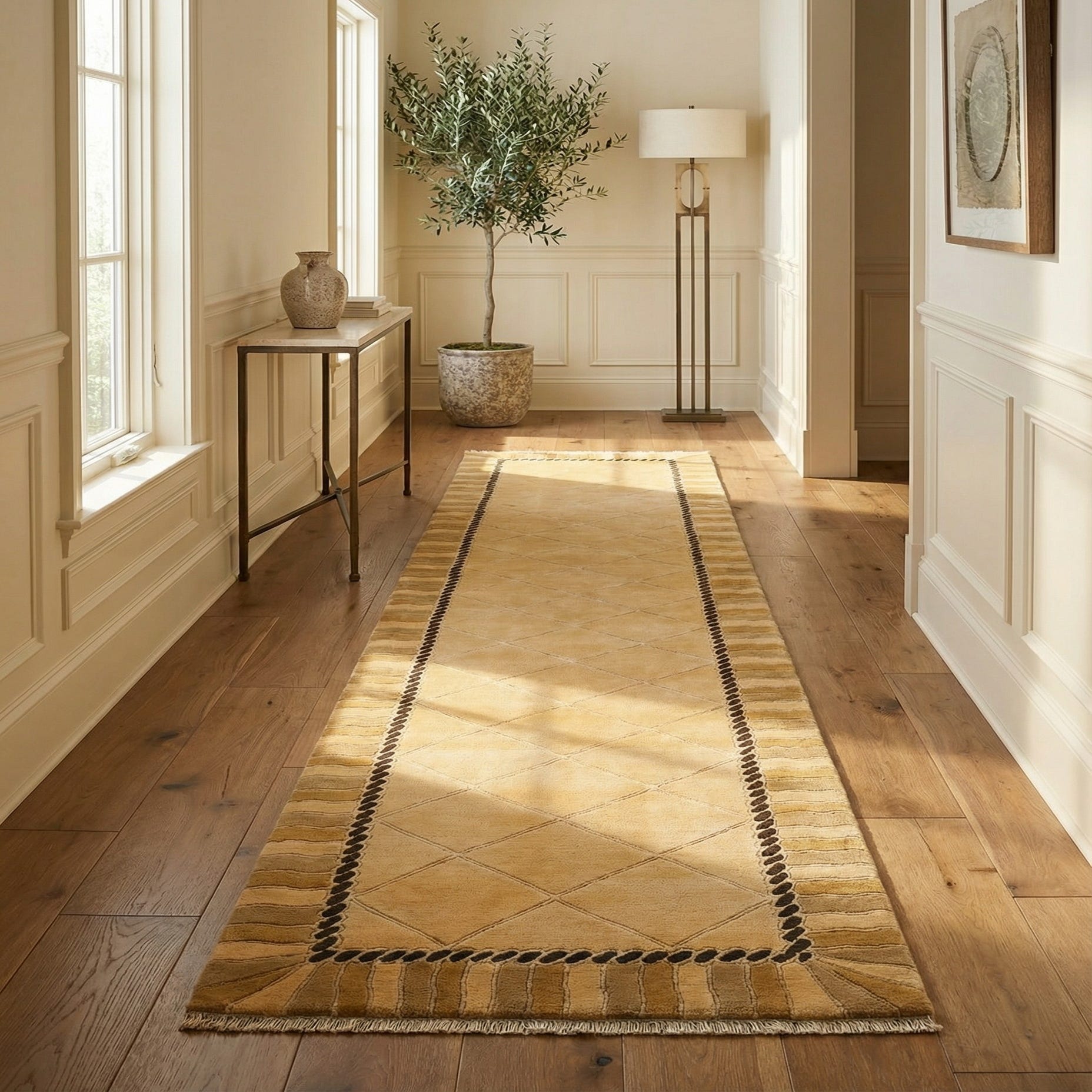 Primary color is Mustard Yellow. Colors in this rug include: Mustard Yellow, Brown, Tan.