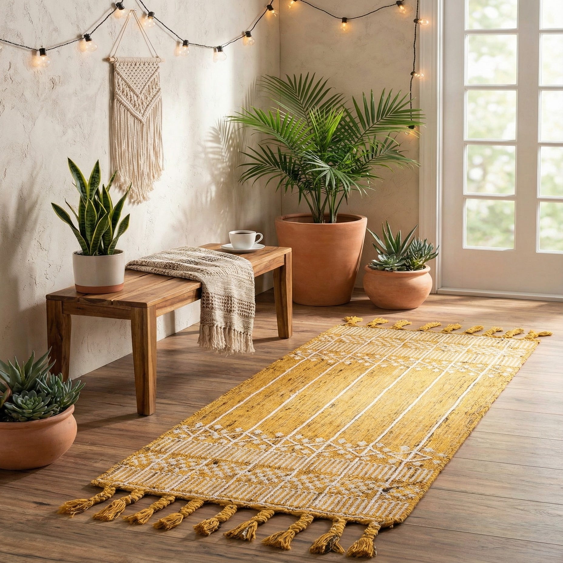 Primary color is Mustard Yellow. Colors in this rug include: Mustard Yellow, Ivory.