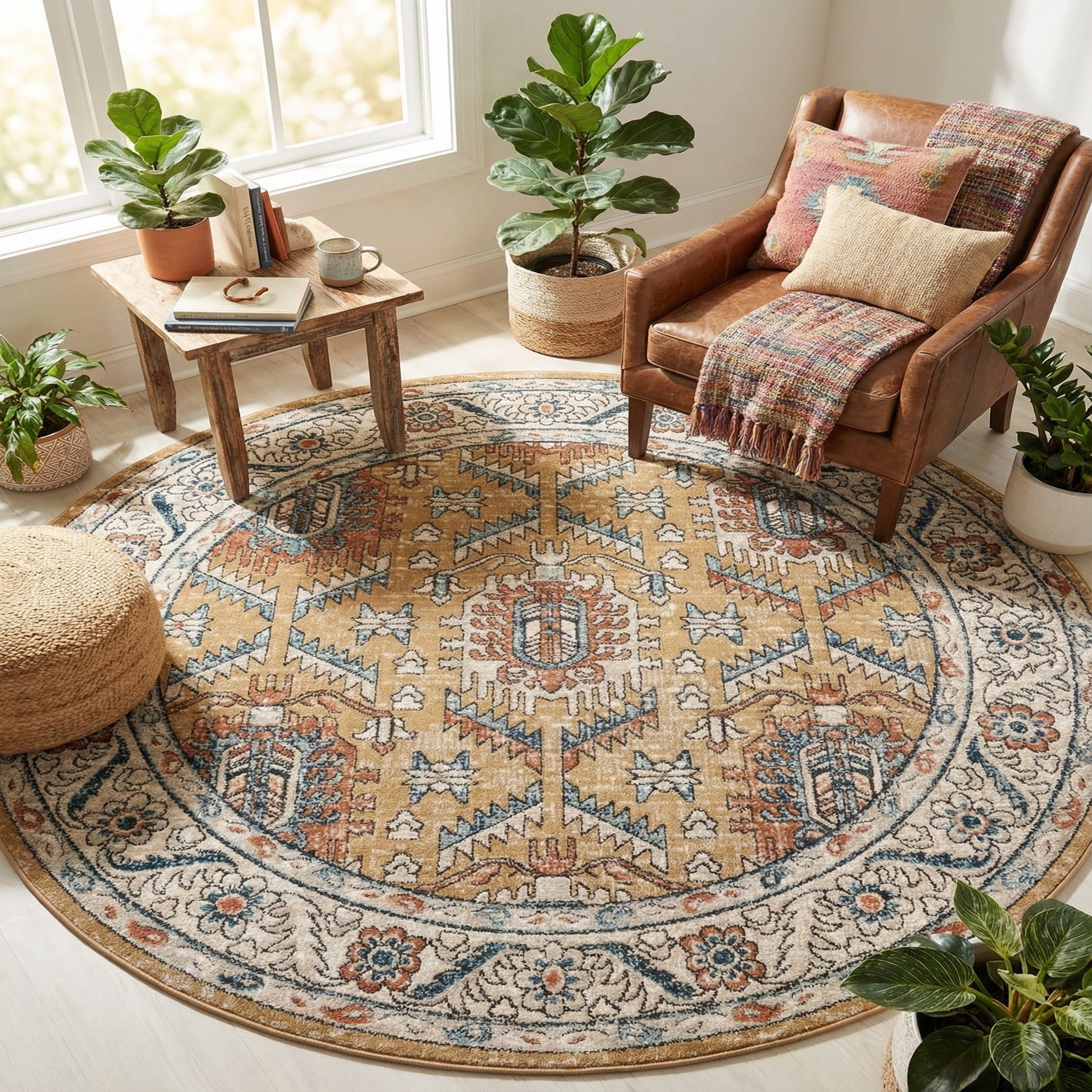 Primary color is Mustard Yellow. Colors in this rug include: Mustard Yellow, Black, Blue, Gray, Ivory, Rust Red.