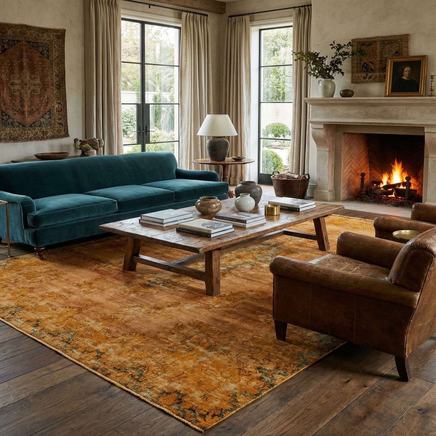 Primary color is Mustard Yellow. Colors in this rug include: Mustard Yellow, Brown, Blue.