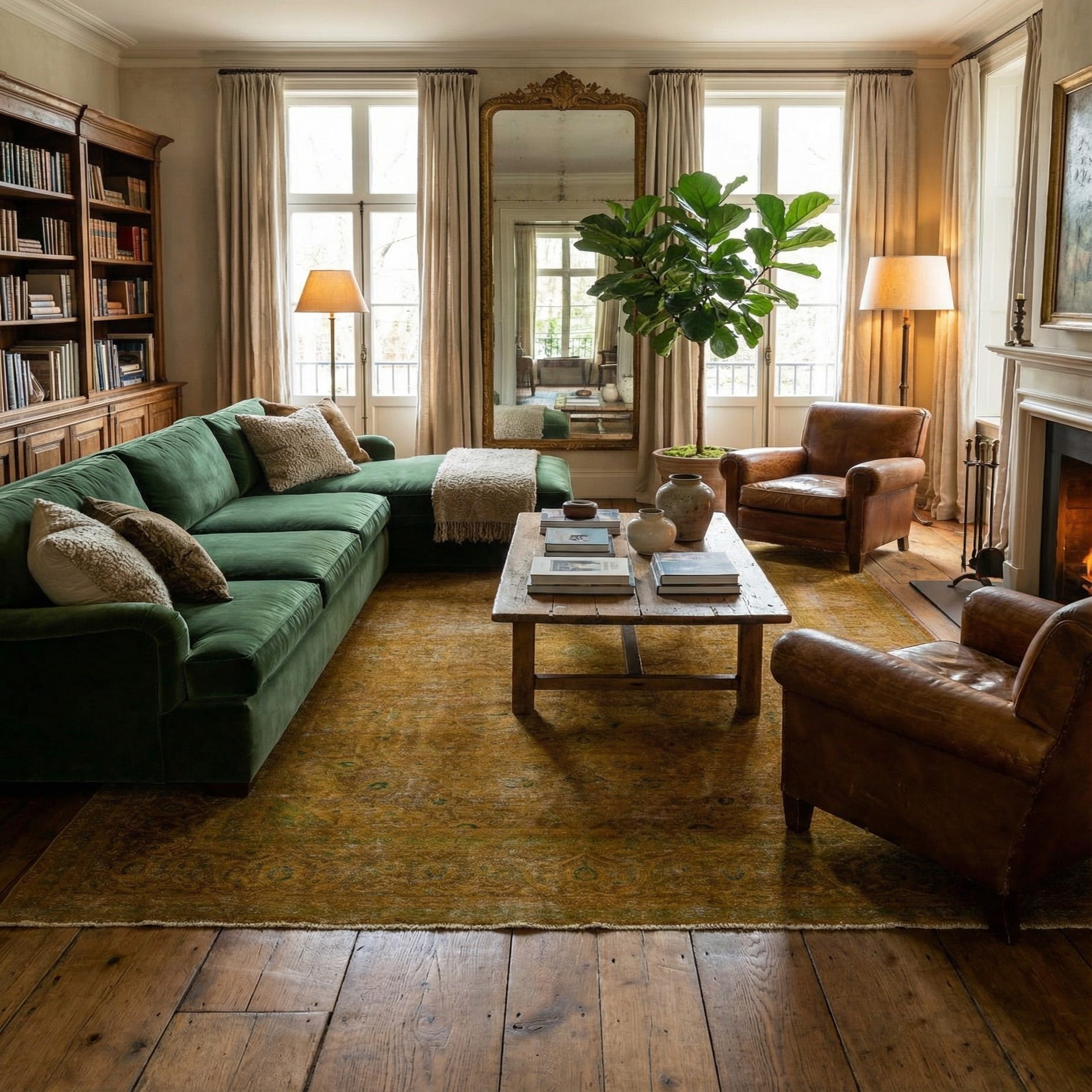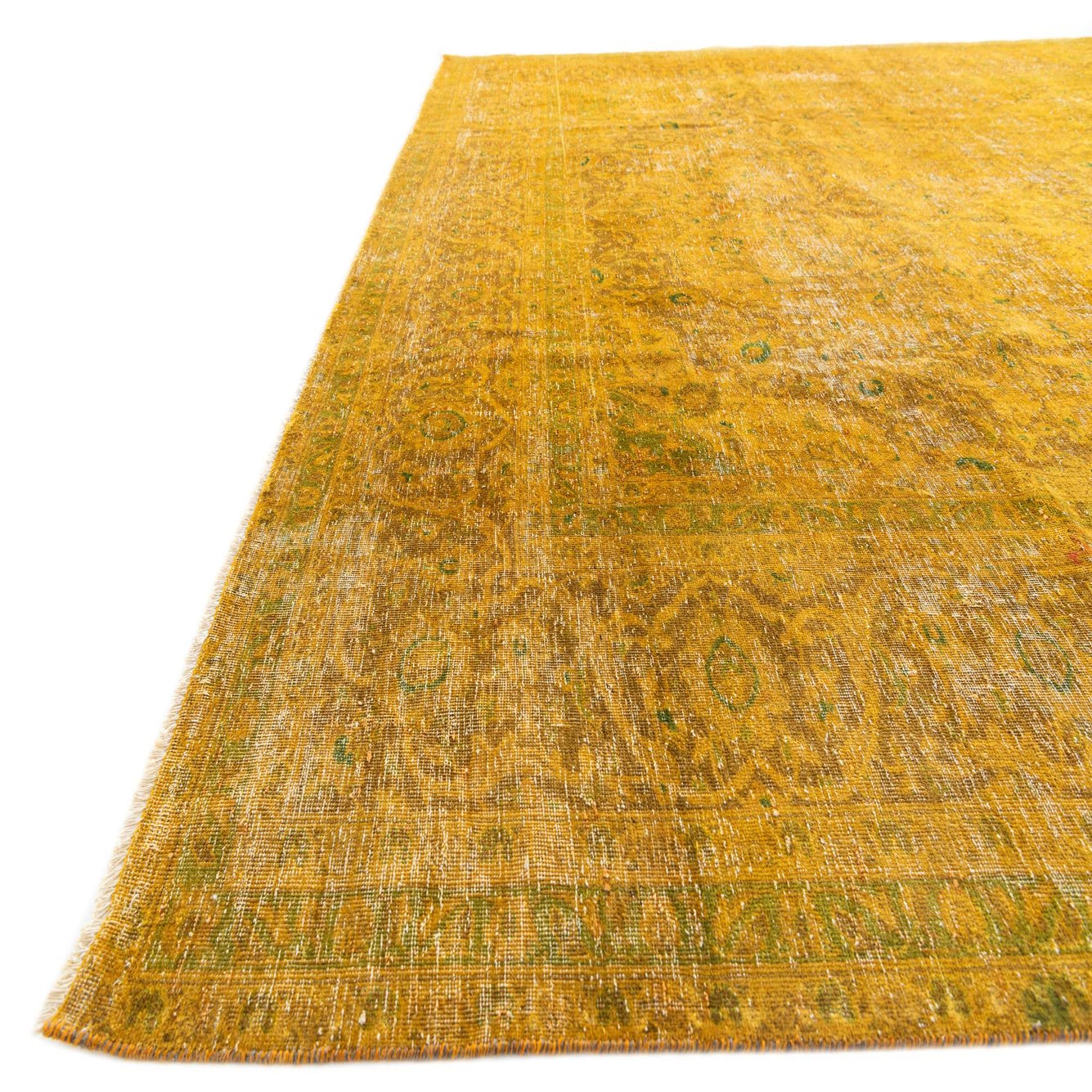 Primary color is Mustard Yellow. Colors in this rug include: Mustard Yellow, Brown, Green, Ivory.