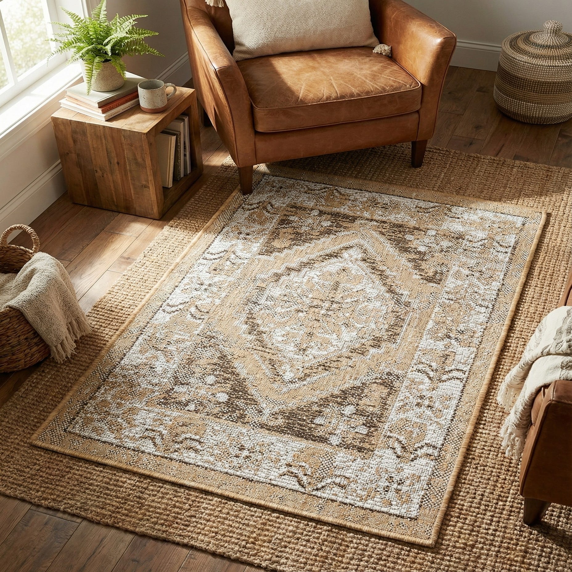 Primary color is Natural. Colors in this rug include: Natural, Brown, Ivory.