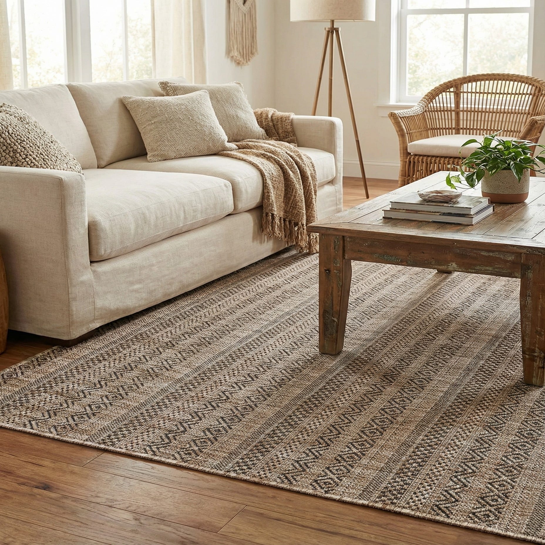 Primary color is Natural. Colors in this rug include: Natural, Black, Ivory.