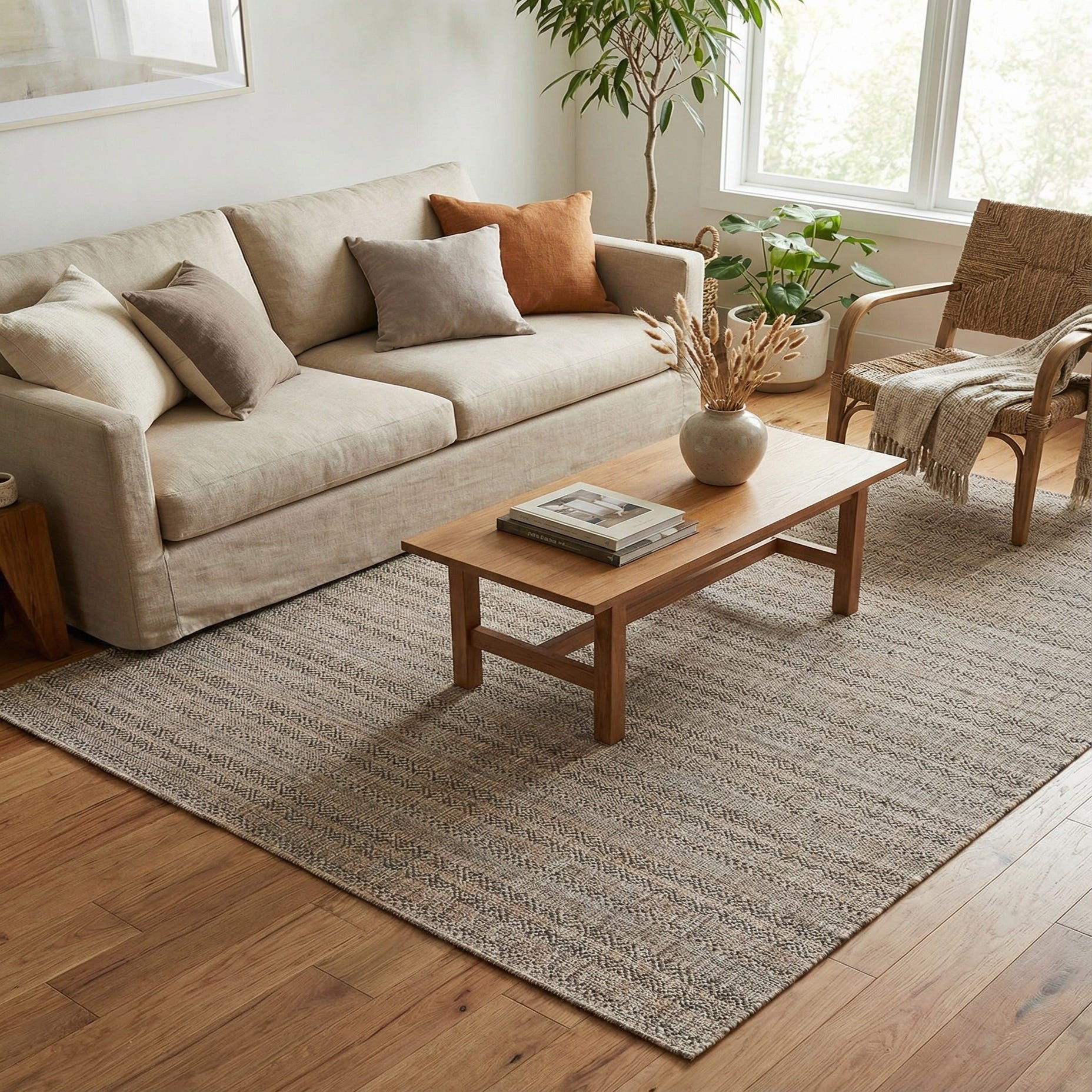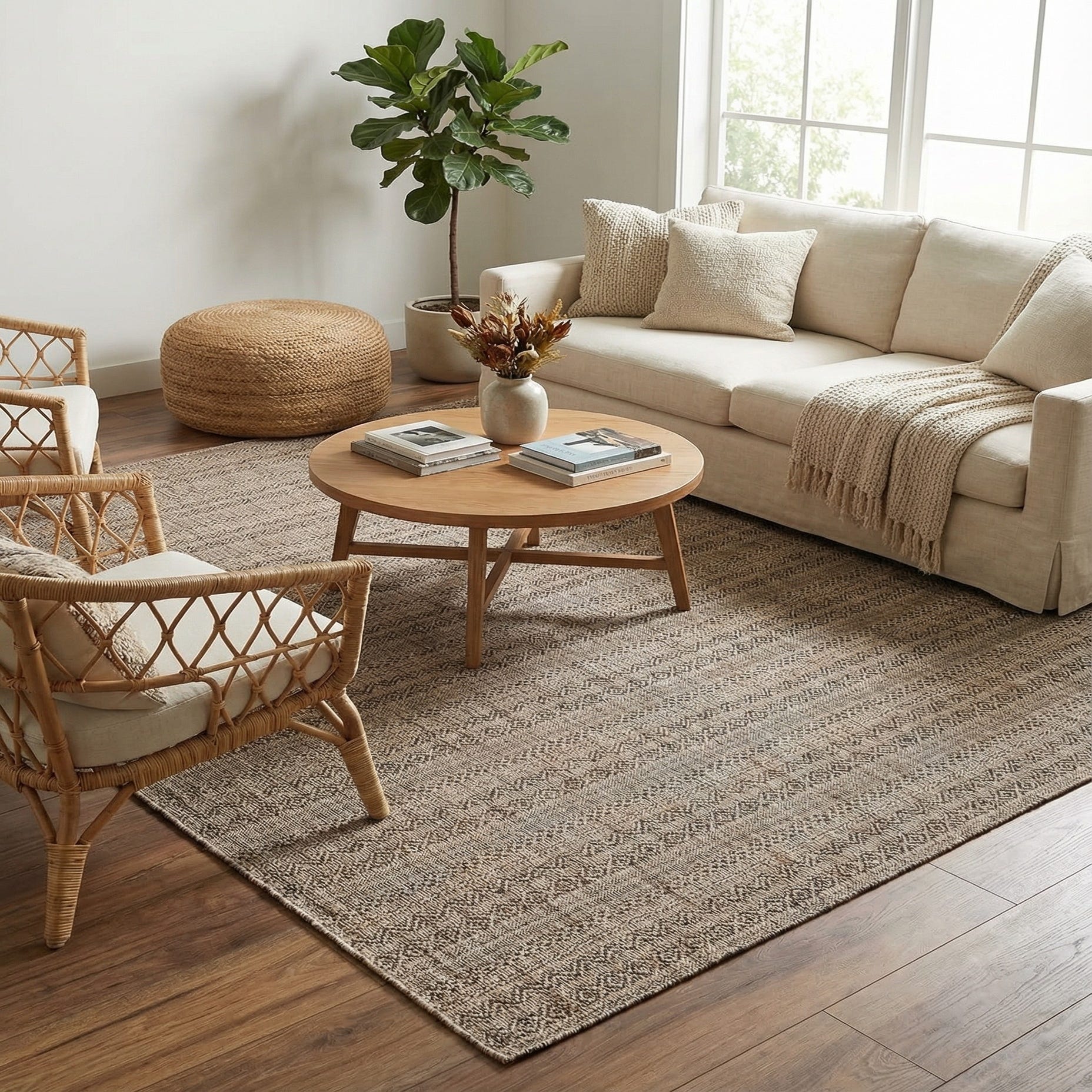 Primary color is Natural. Colors in this rug include: Natural, Black, Ivory.