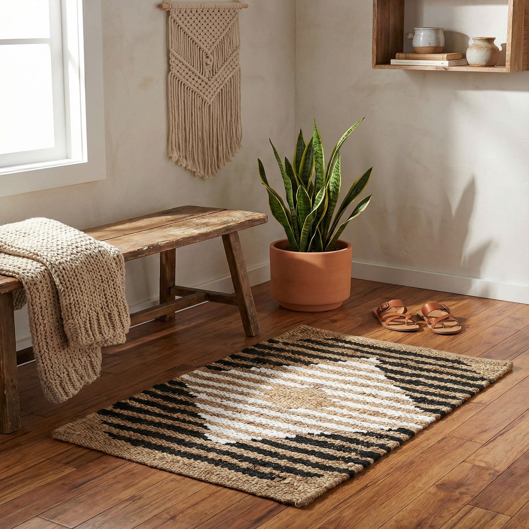 Primary color is Natural Black. Colors in this rug include: Natural Black, Ivory.