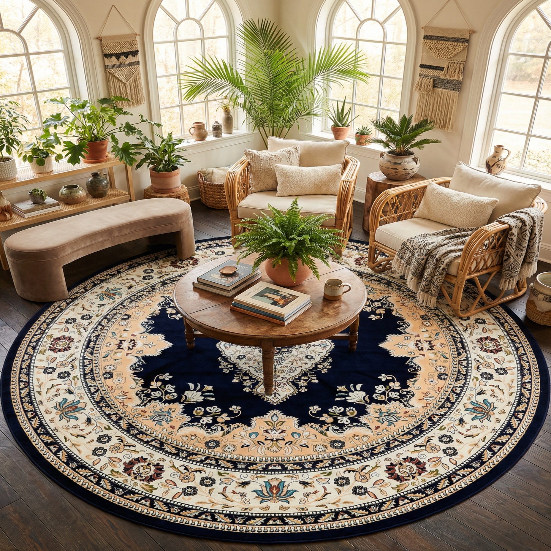 Primary color is Navy Blue. Colors in this rug include: Navy Blue, Blue, Burgundy, Cream, Green, Ivory, Plum Red, Tan.