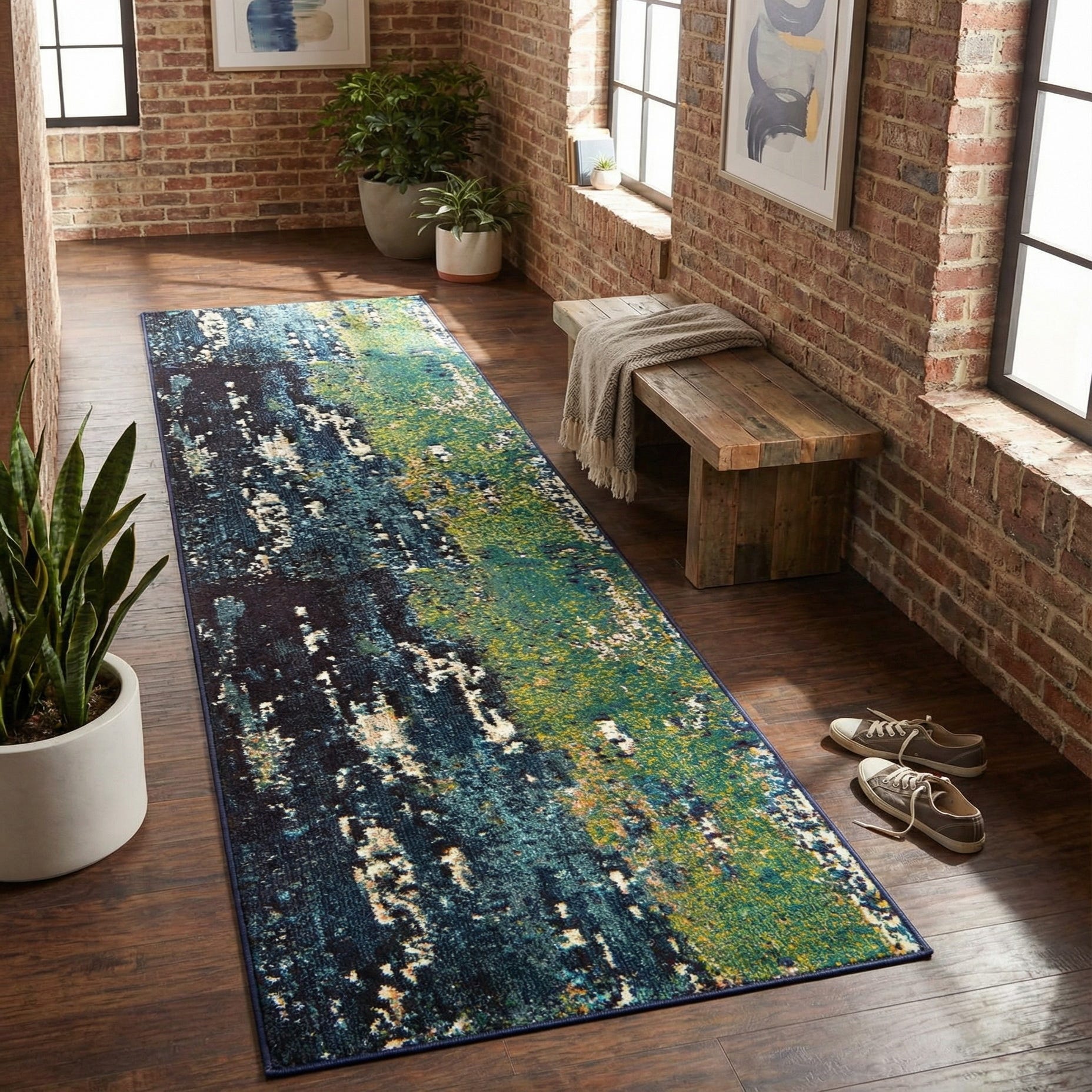 Primary color is Navy Blue. Colors in this rug include: Navy Blue, Beige, Blue, Green, Light Blue, Yellow.