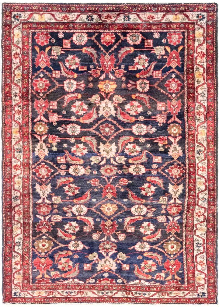 Primary color is Navy Blue. Colors in this rug include: Navy Blue, Beige, Black, Blue, Brown, Ivory, Olive.