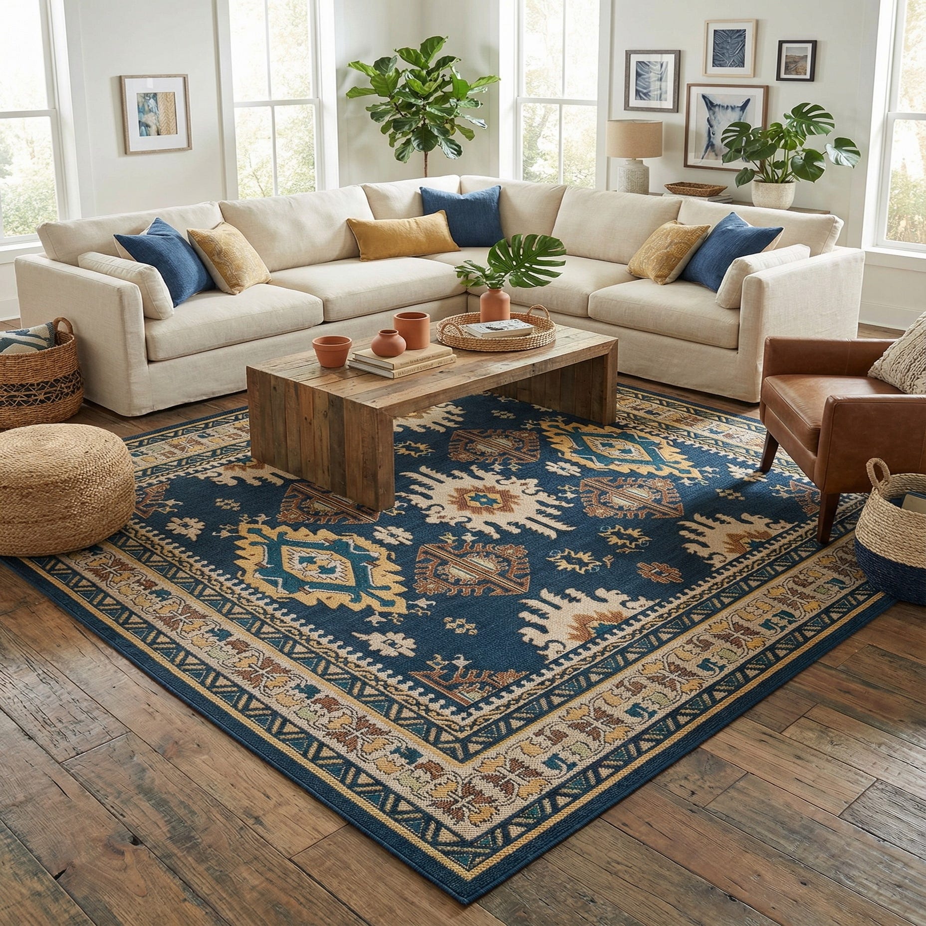 Primary color is Navy Blue. Colors in this rug include: Navy Blue, Ivory, Red, Yellow, Green.