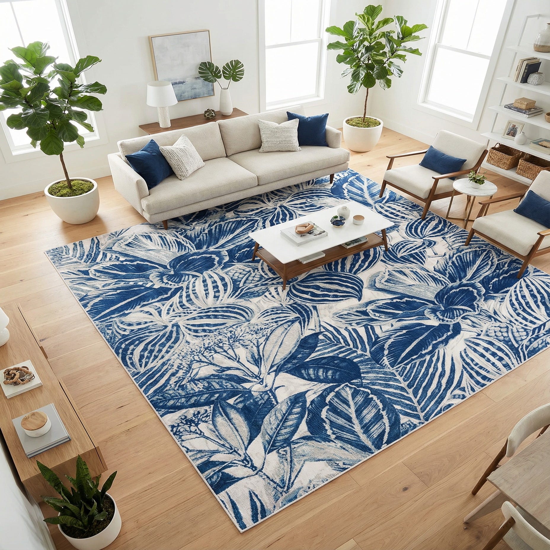 Primary color is Navy Blue. Colors in this rug include: Navy Blue, Ivory, Gray, Light Blue.