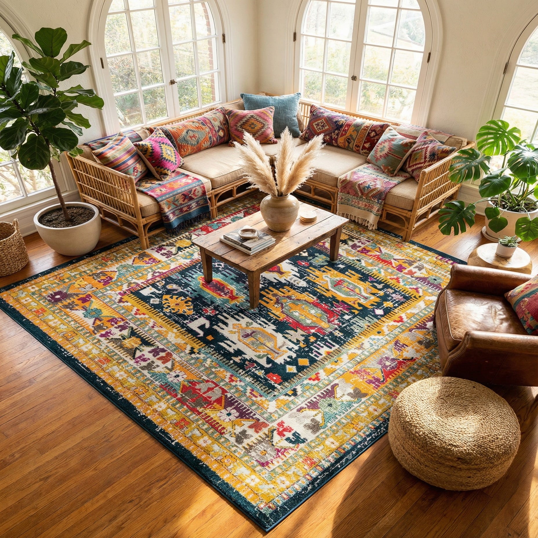 Primary color is Navy Blue. Colors in this rug include: Navy Blue, Black, Blue, Gray, Green, Ivory, Light Blue, Orange, Purple, Red.