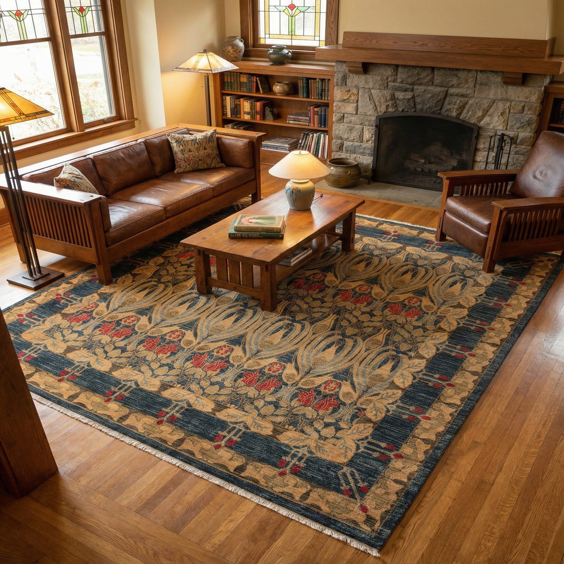 Primary color is Navy Blue. Colors in this rug include: Navy Blue, Tan, Olive, Red, Blue, Brown.