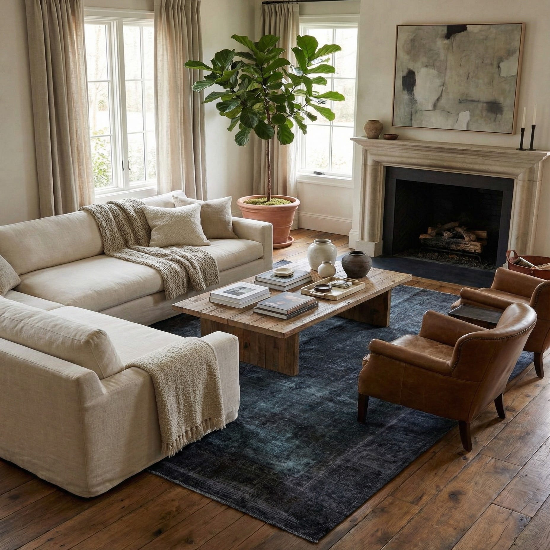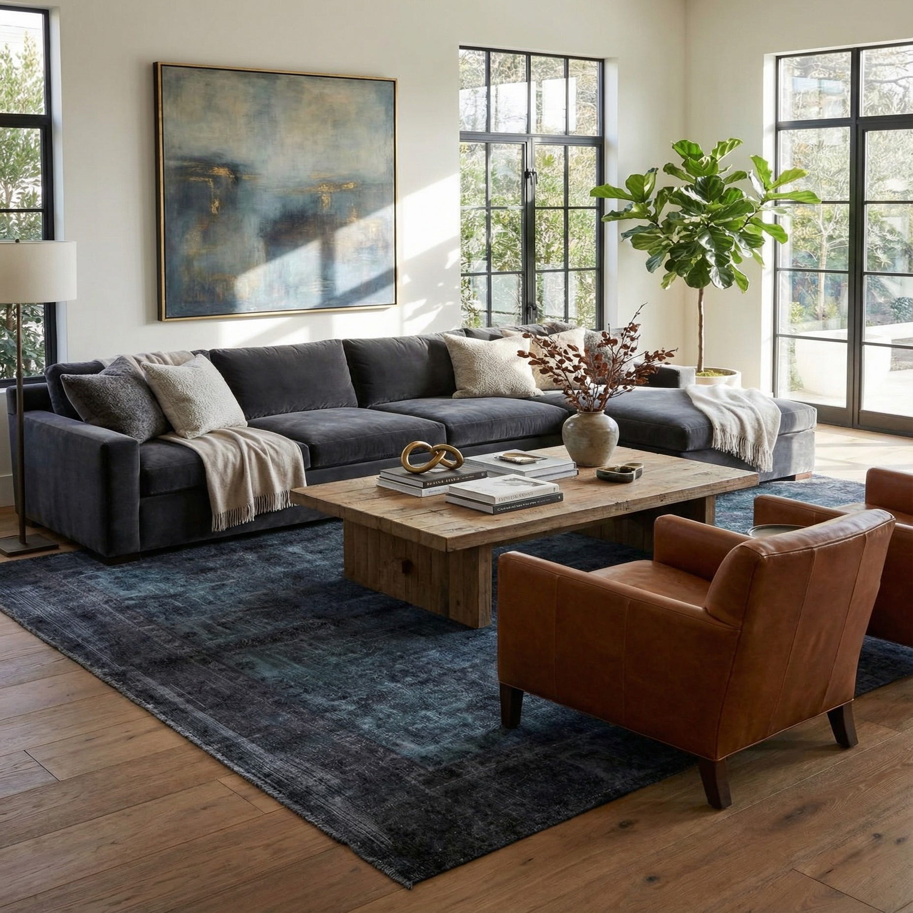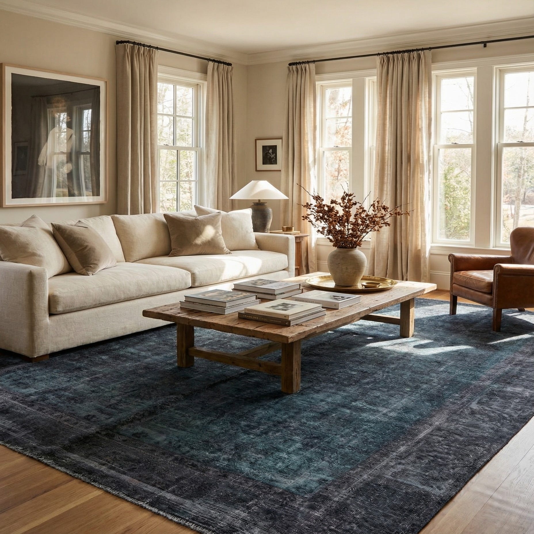 Primary color is Navy Blue. Colors in this rug include: Navy Blue, Black, Ivory.