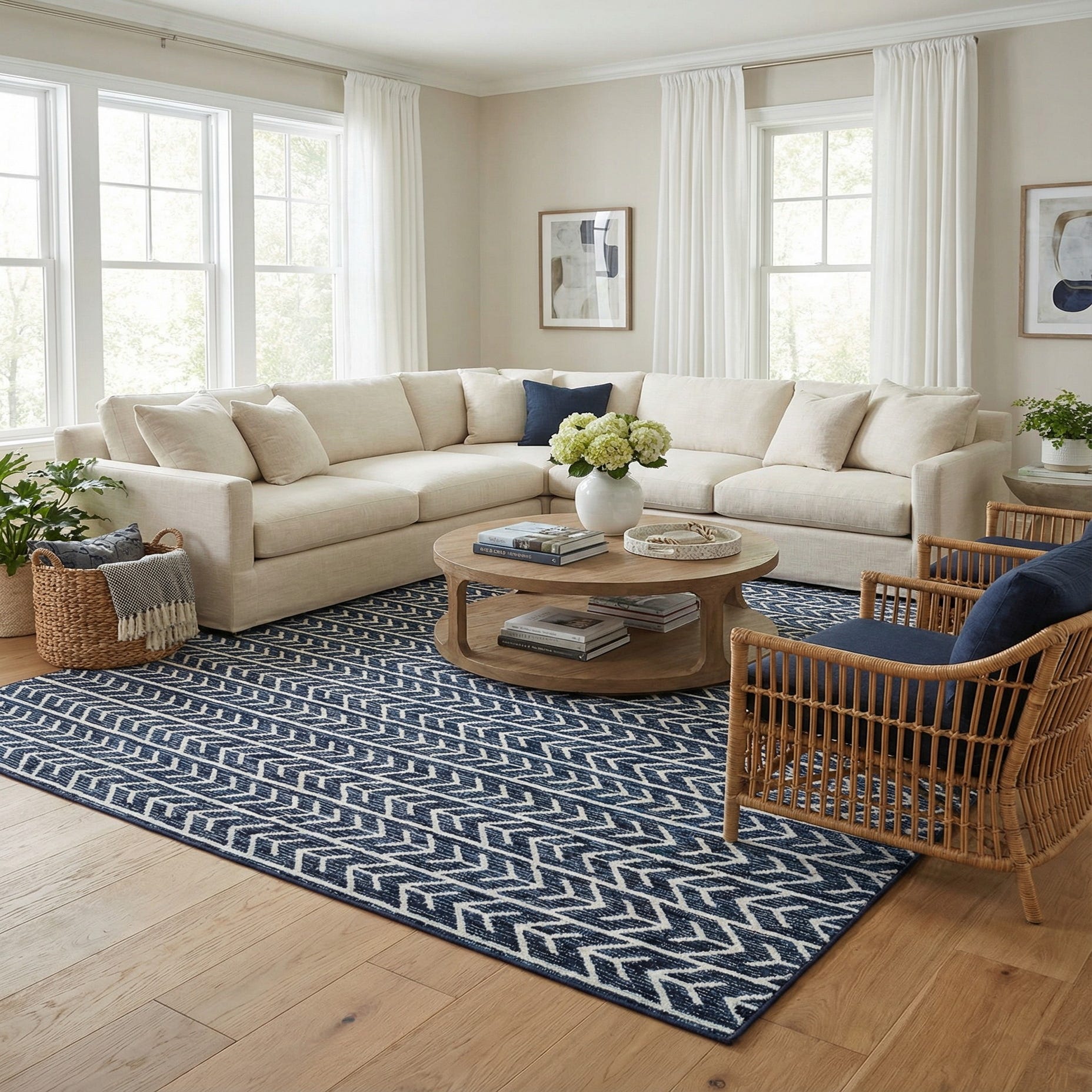 Primary color is Navy Blue. Colors in this rug include: Navy Blue, Ivory, Light Blue.