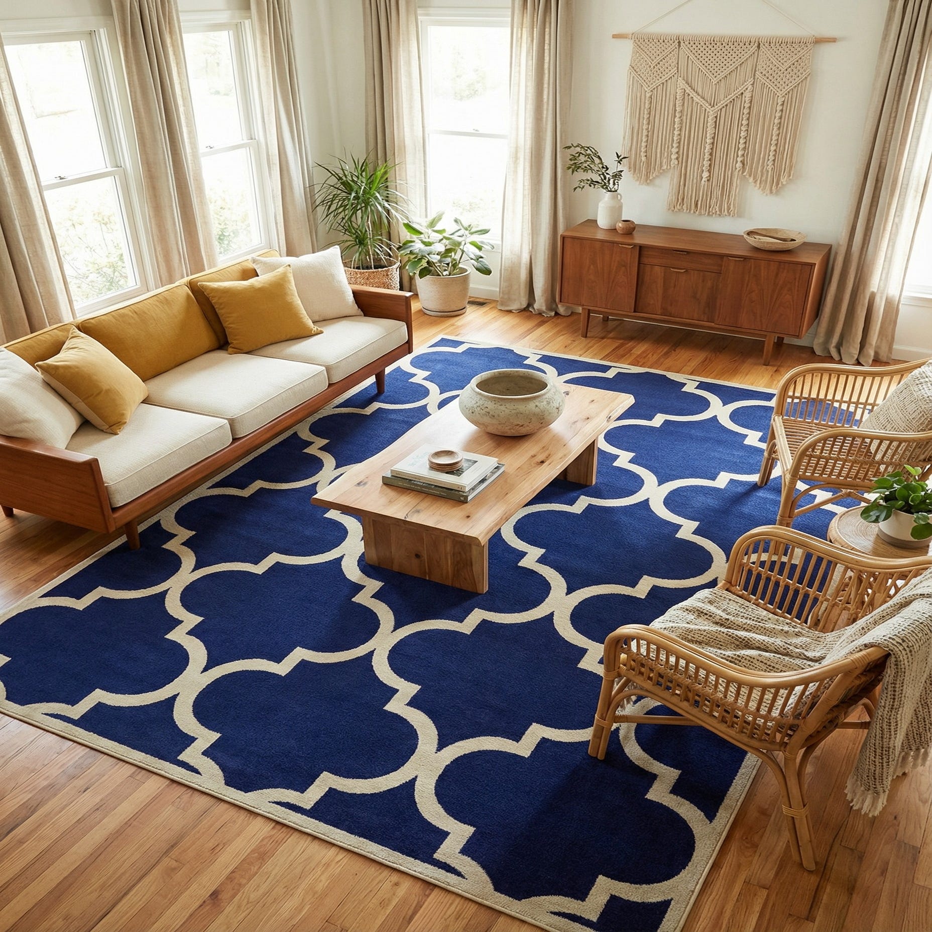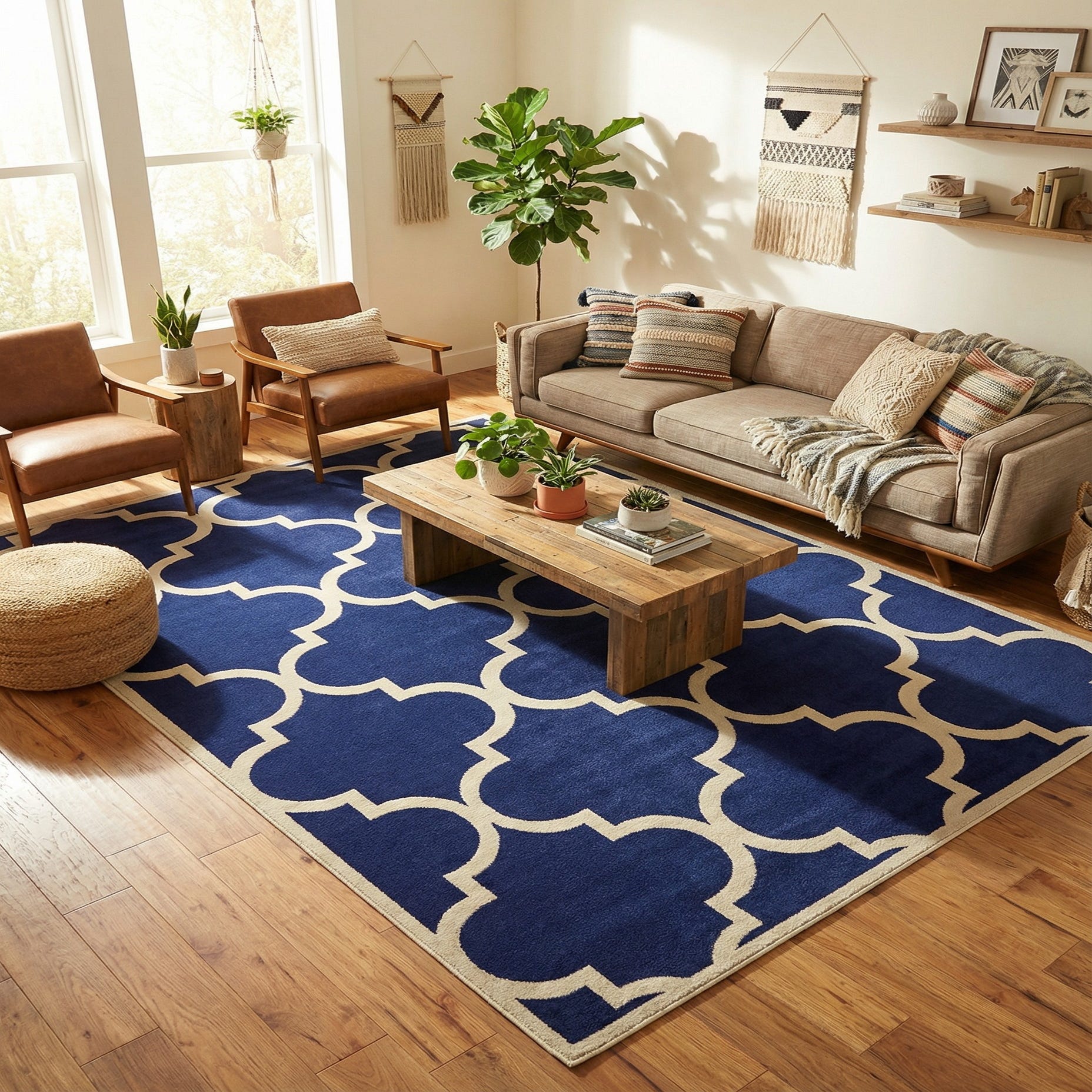 Primary color is Navy Blue. Colors in this rug include: Navy Blue, Beige.