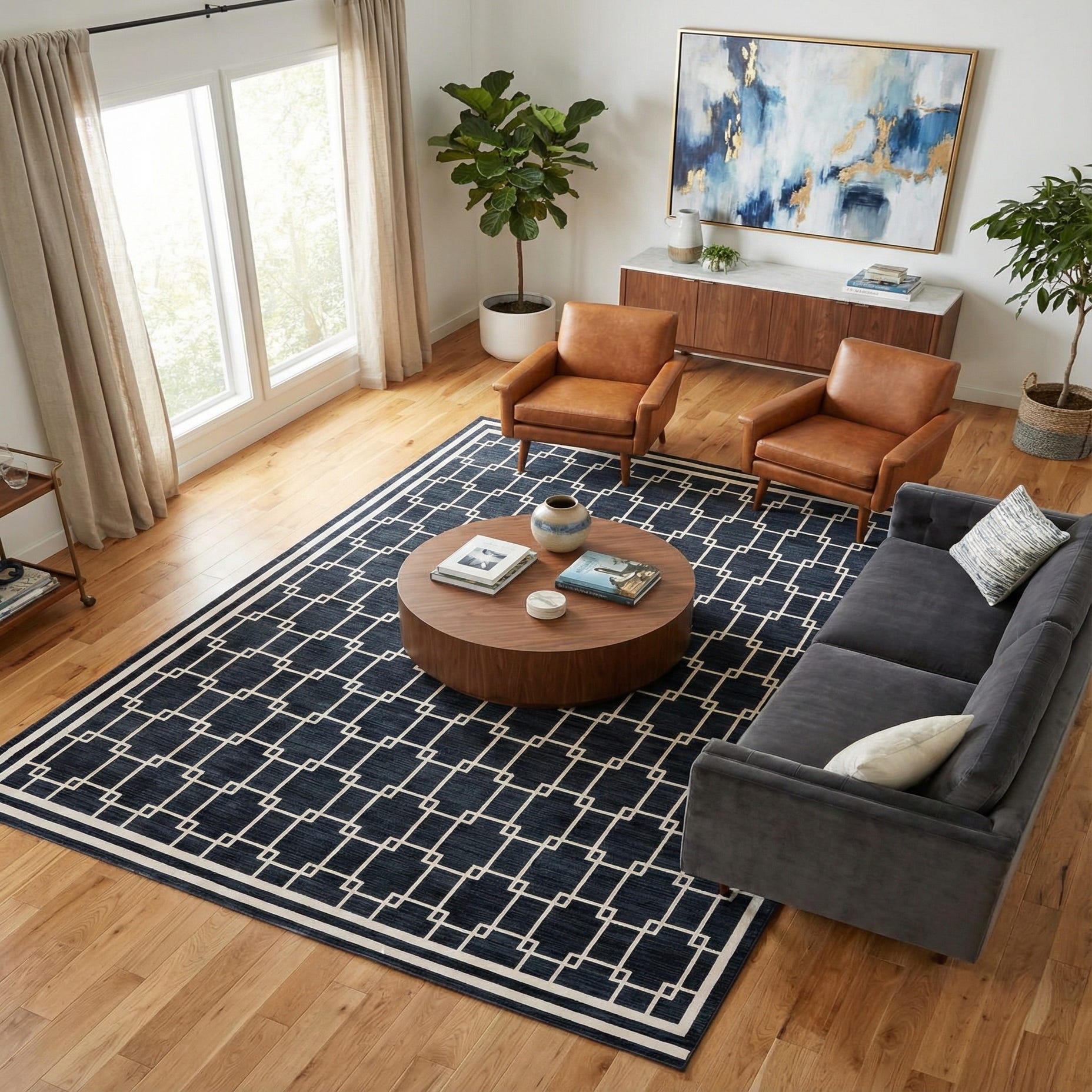 Primary color is Navy Blue. Colors in this rug include: Navy Blue, Ivory.