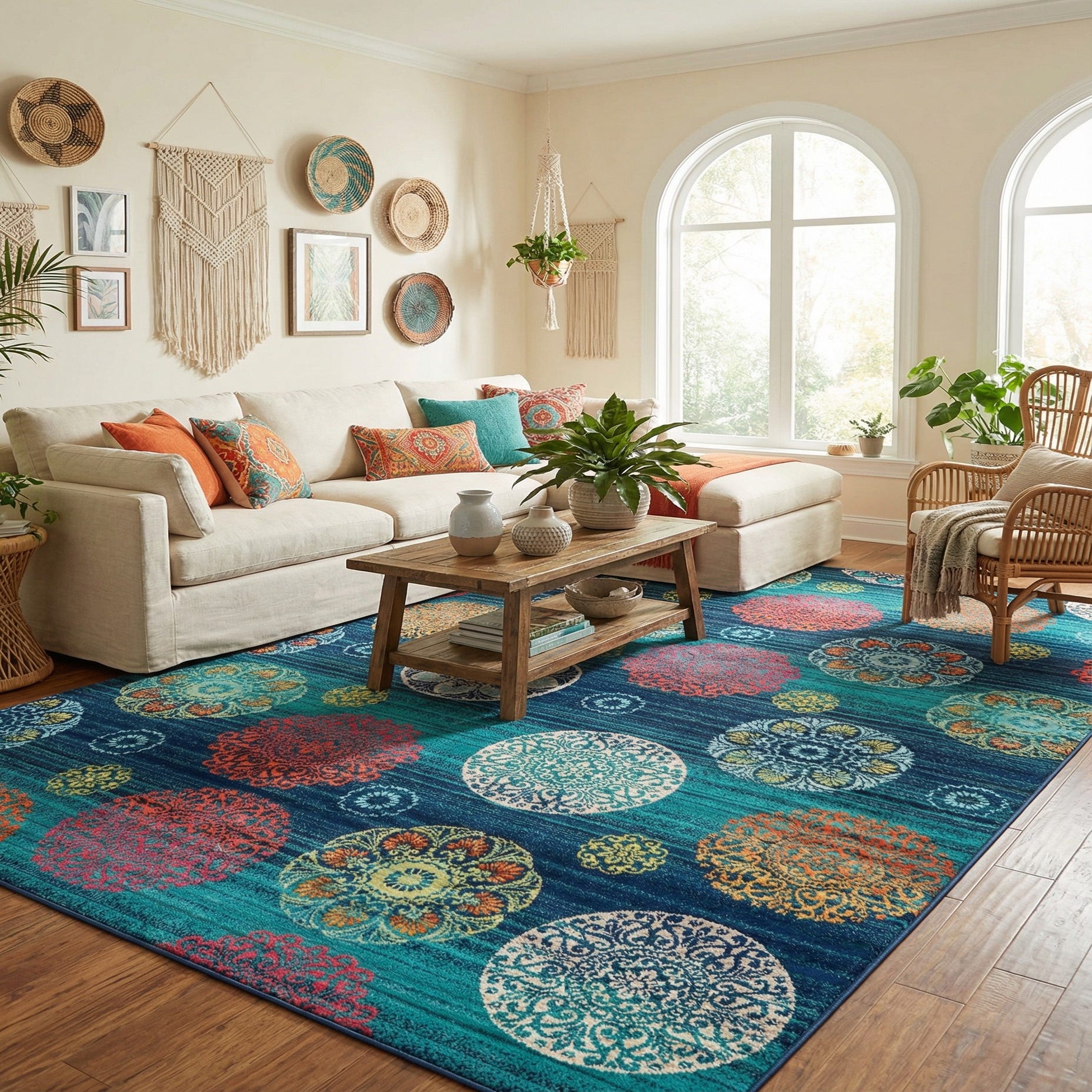 Primary color is Navy Blue. Colors in this rug include: Navy Blue, Ivory, Light Blue, Light Green, Orange, Yellow, Turquoise, Pink.