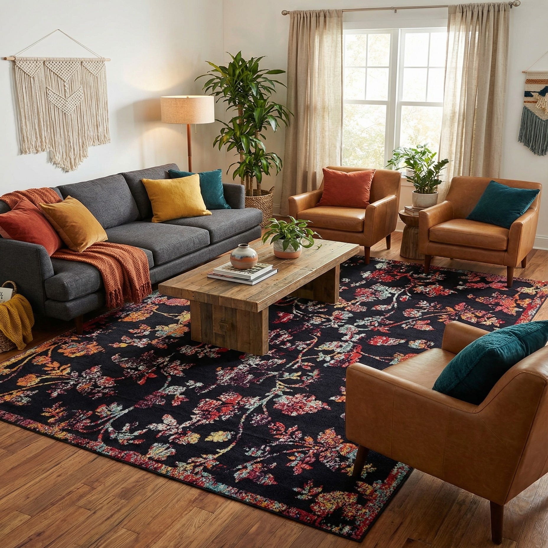 Primary color is Navy Blue. Colors in this rug include: Navy Blue, Blue, Ivory, Light Blue, Red, Yellow, Orange, Purple.
