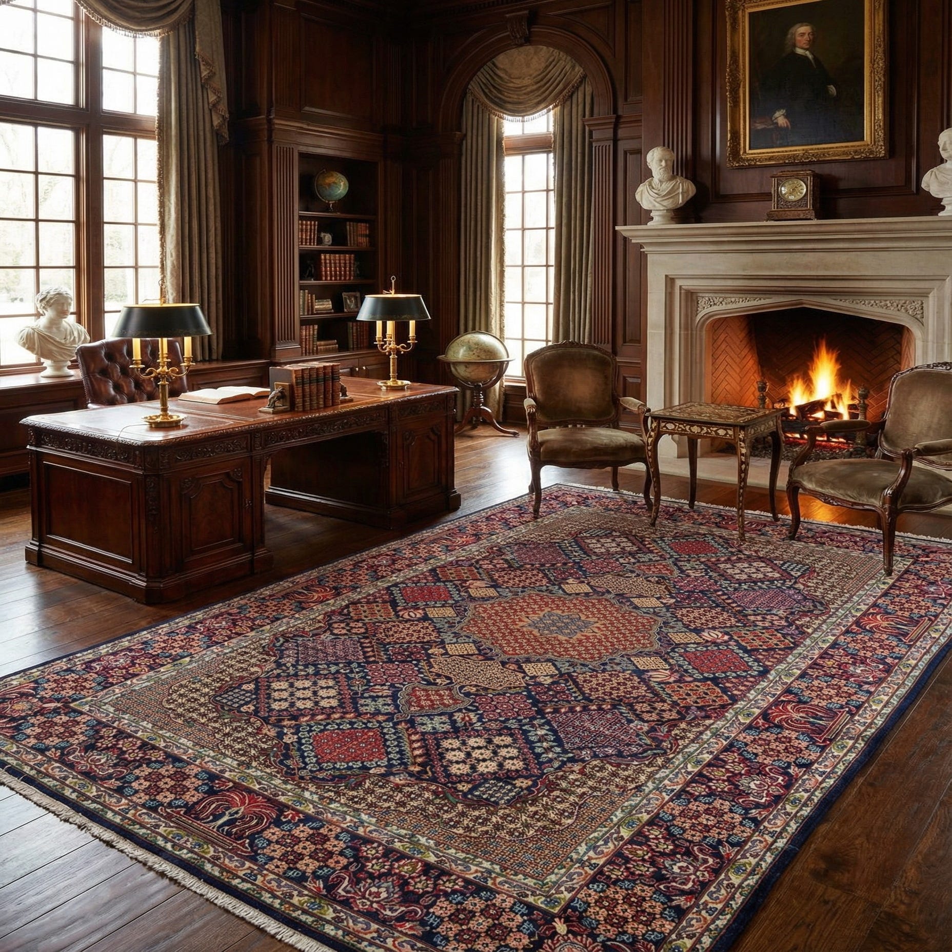 Primary color is Navy Blue. Colors in this rug include: Navy Blue, Black, Beige, Blue, Brown, Green, Red.