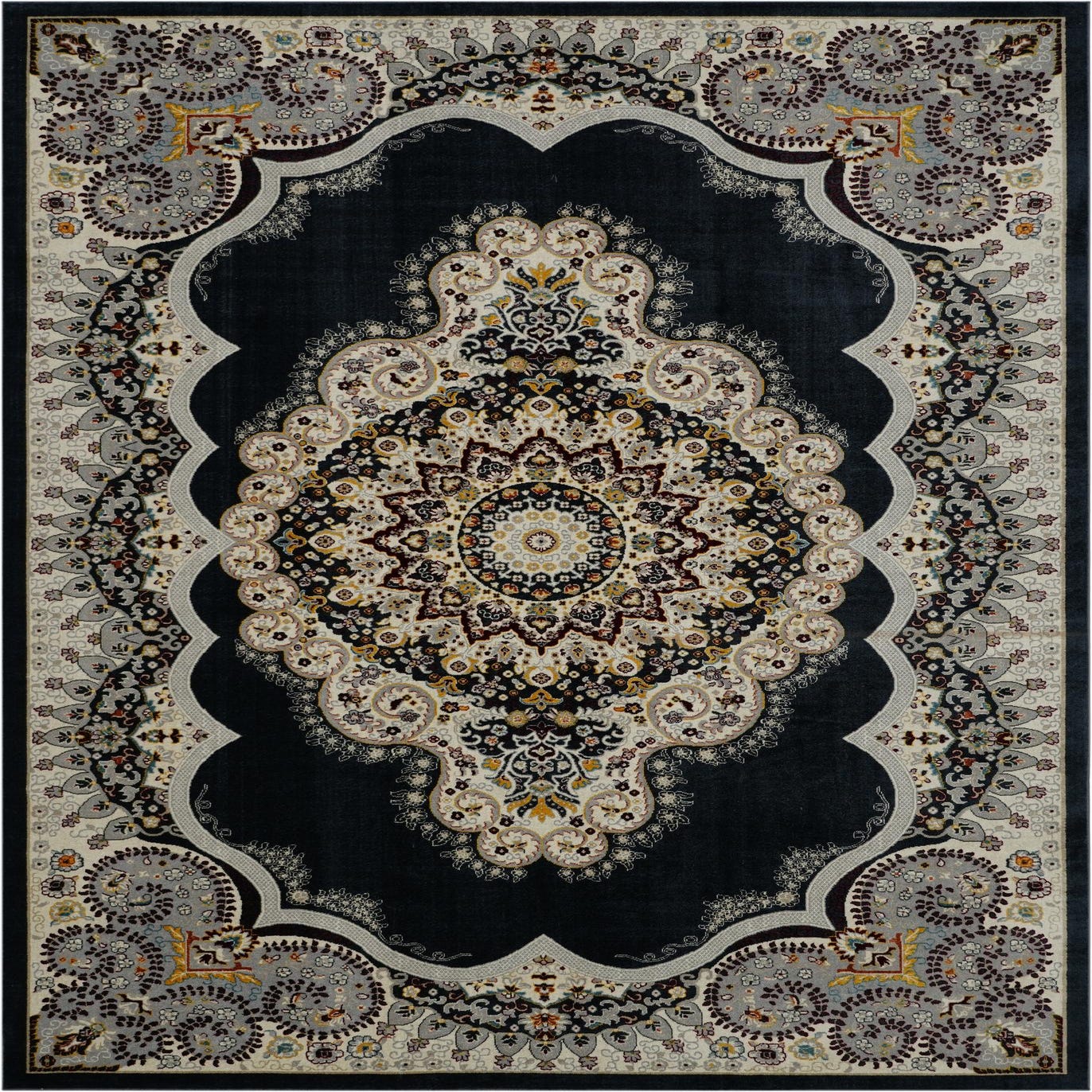 Primary color is Navy Blue. Colors in this rug include: Navy Blue, Gray, Ivory, Red, Yellow.