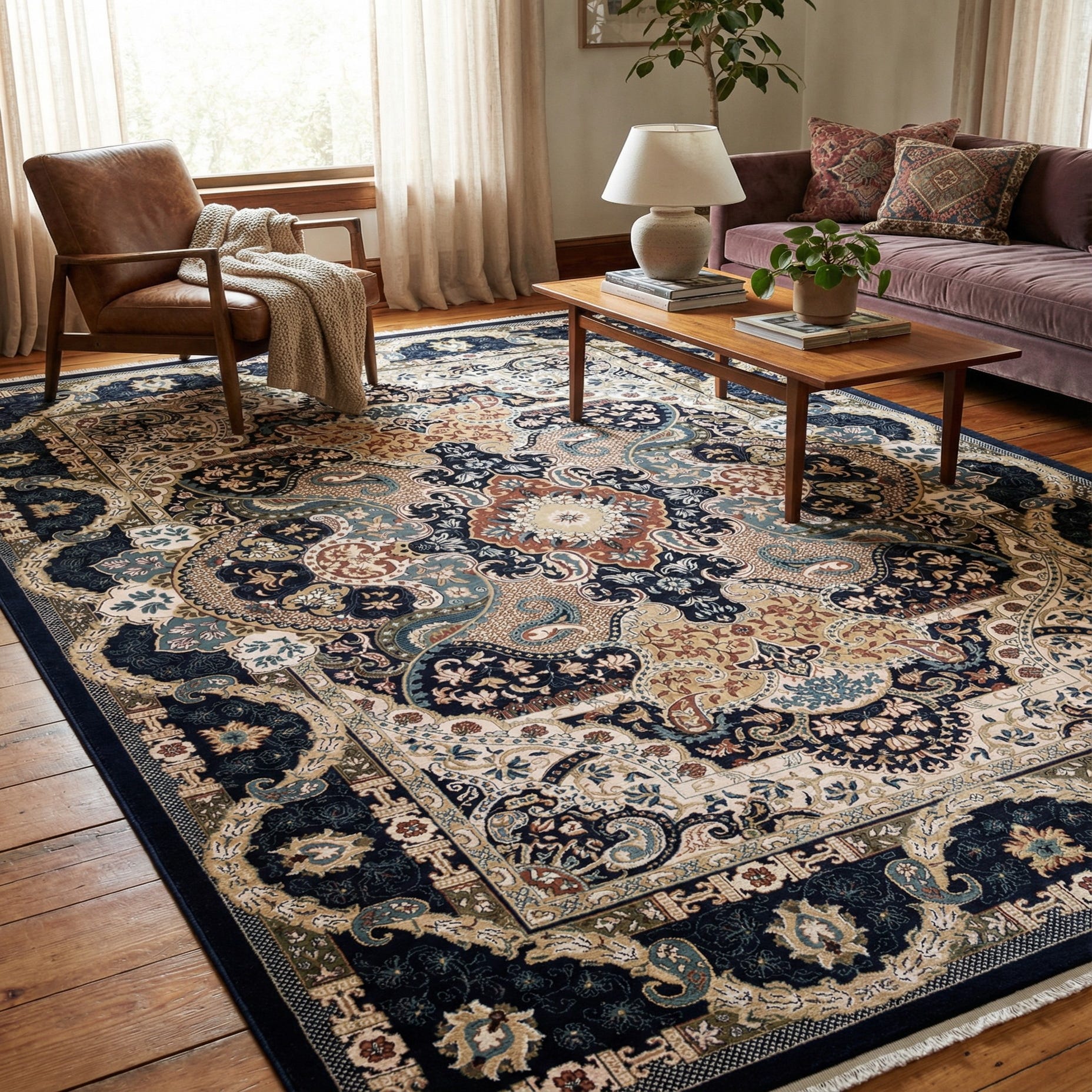 Primary color is Navy Blue. Colors in this rug include: Navy Blue, Blue, Burgundy, Cream, Green, Ivory, Plum Red, Tan.