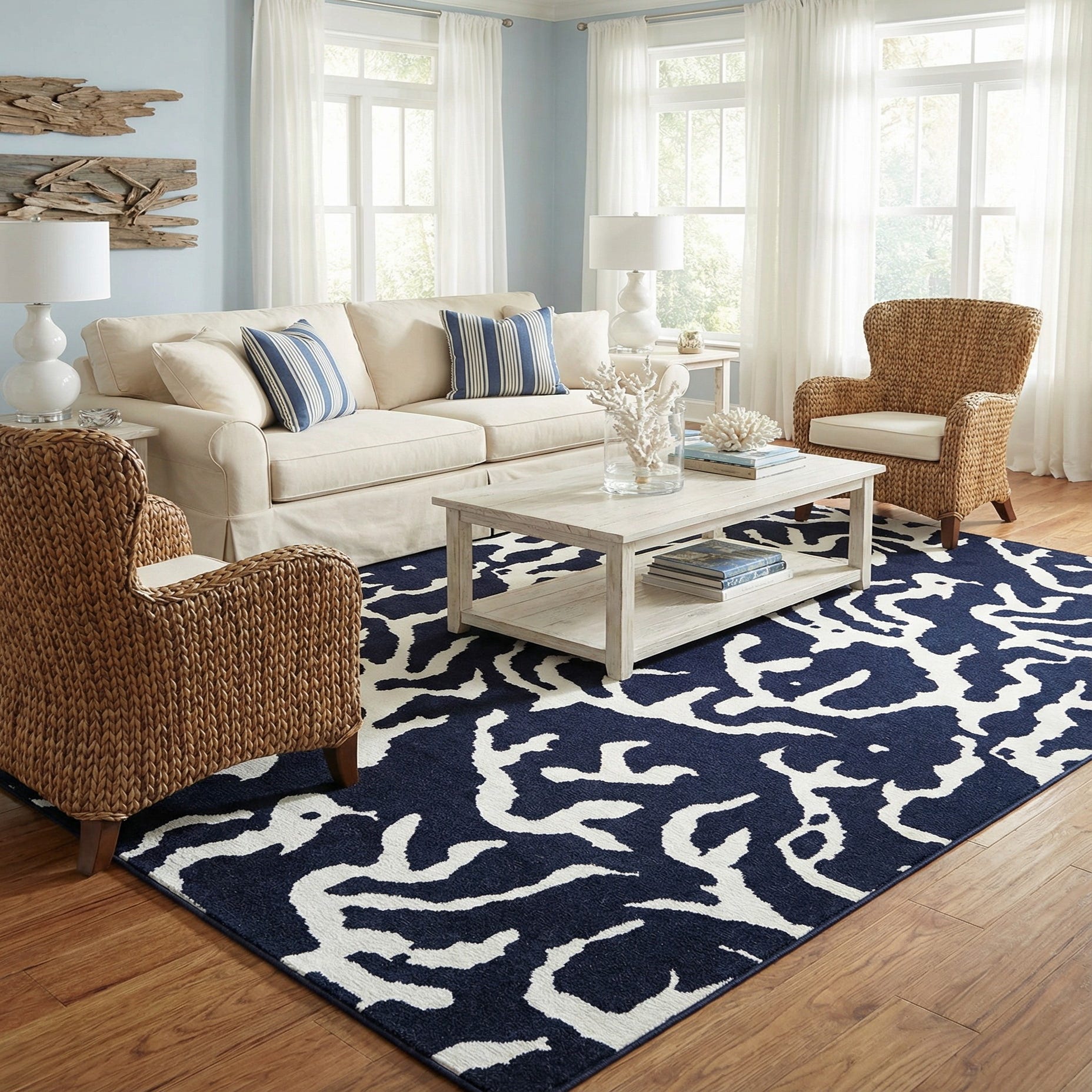 Primary color is Navy Blue. Colors in this rug include: Navy Blue, Ivory.