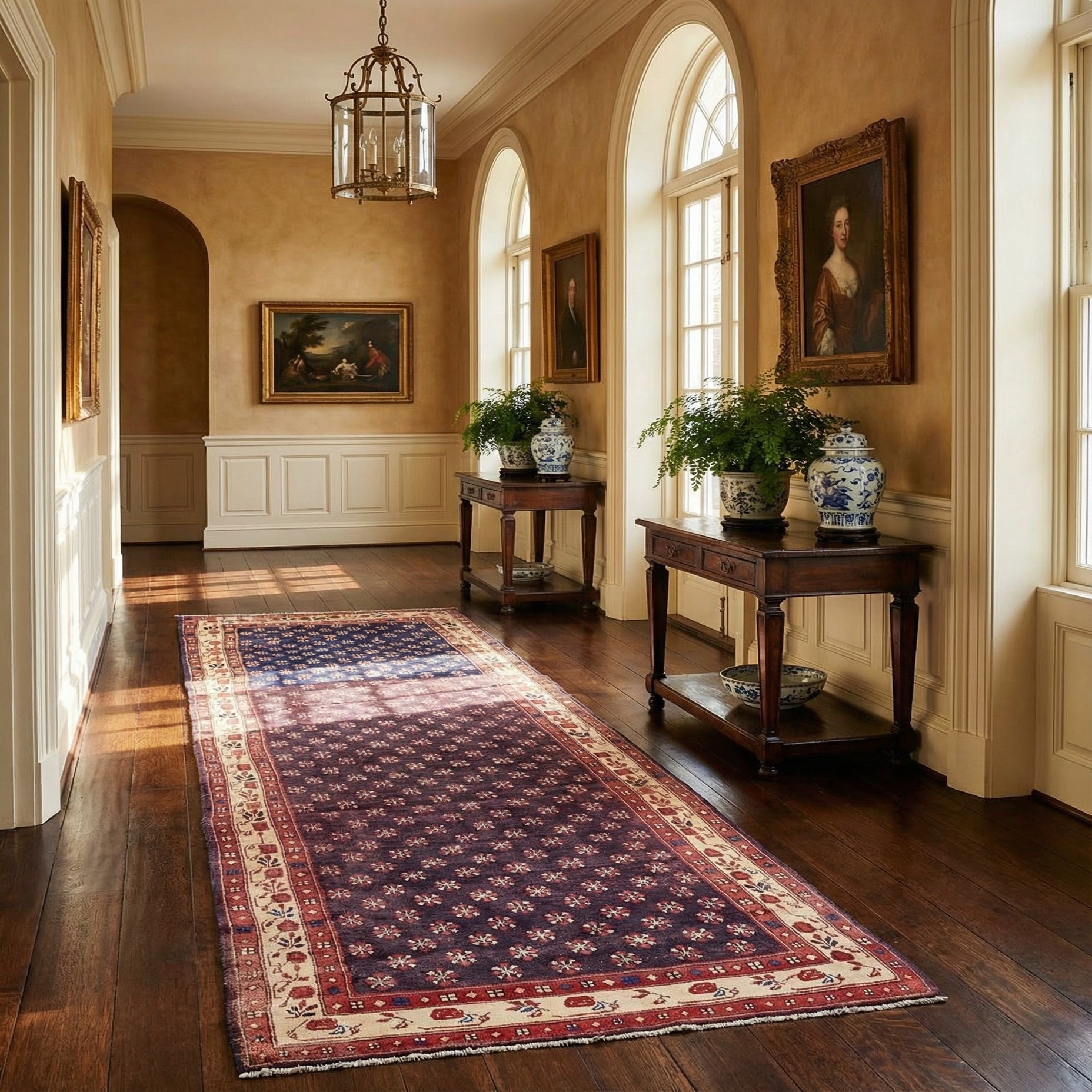 Primary color is Navy Blue. Colors in this rug include: Navy Blue, Cream, Green, Olive, Peach, Red.