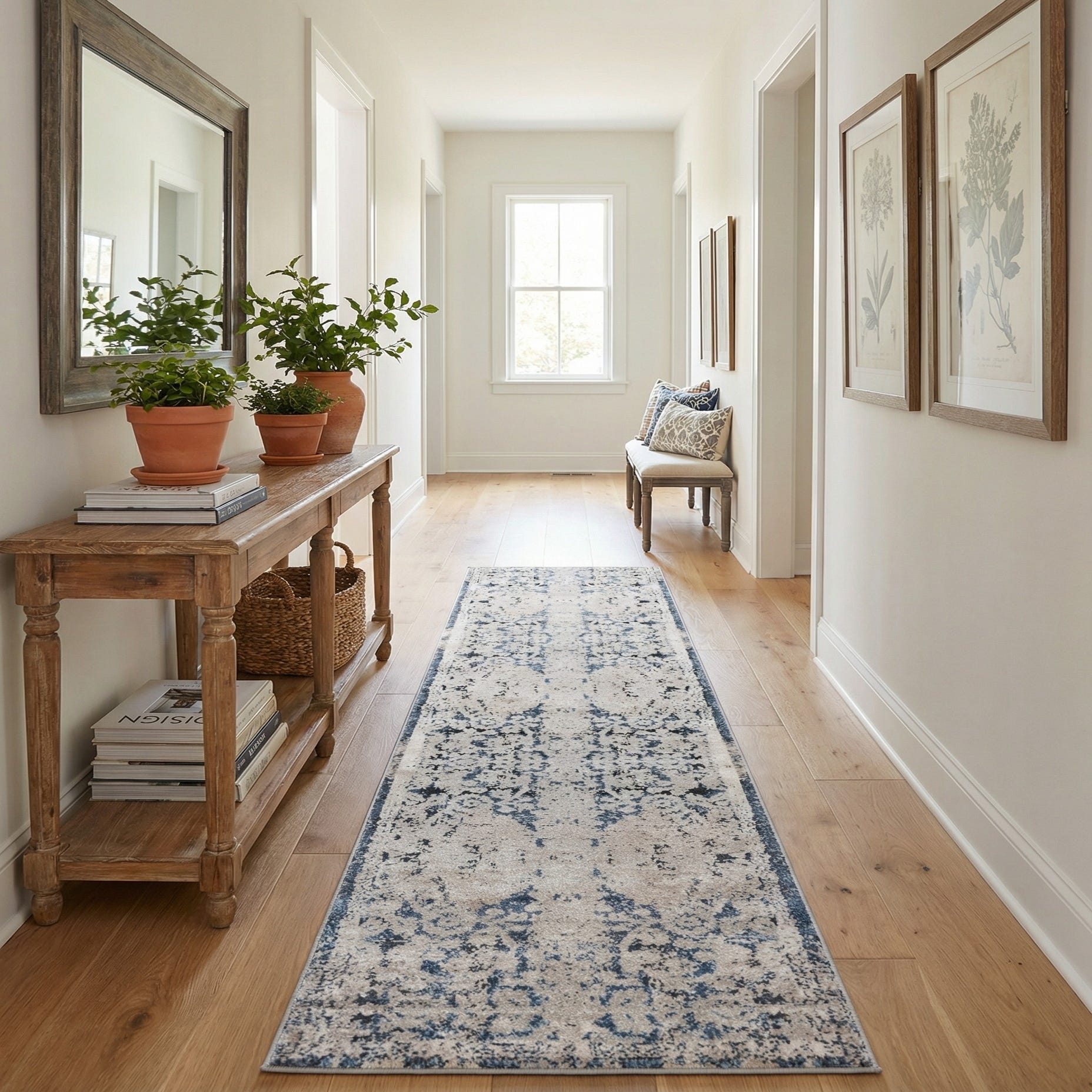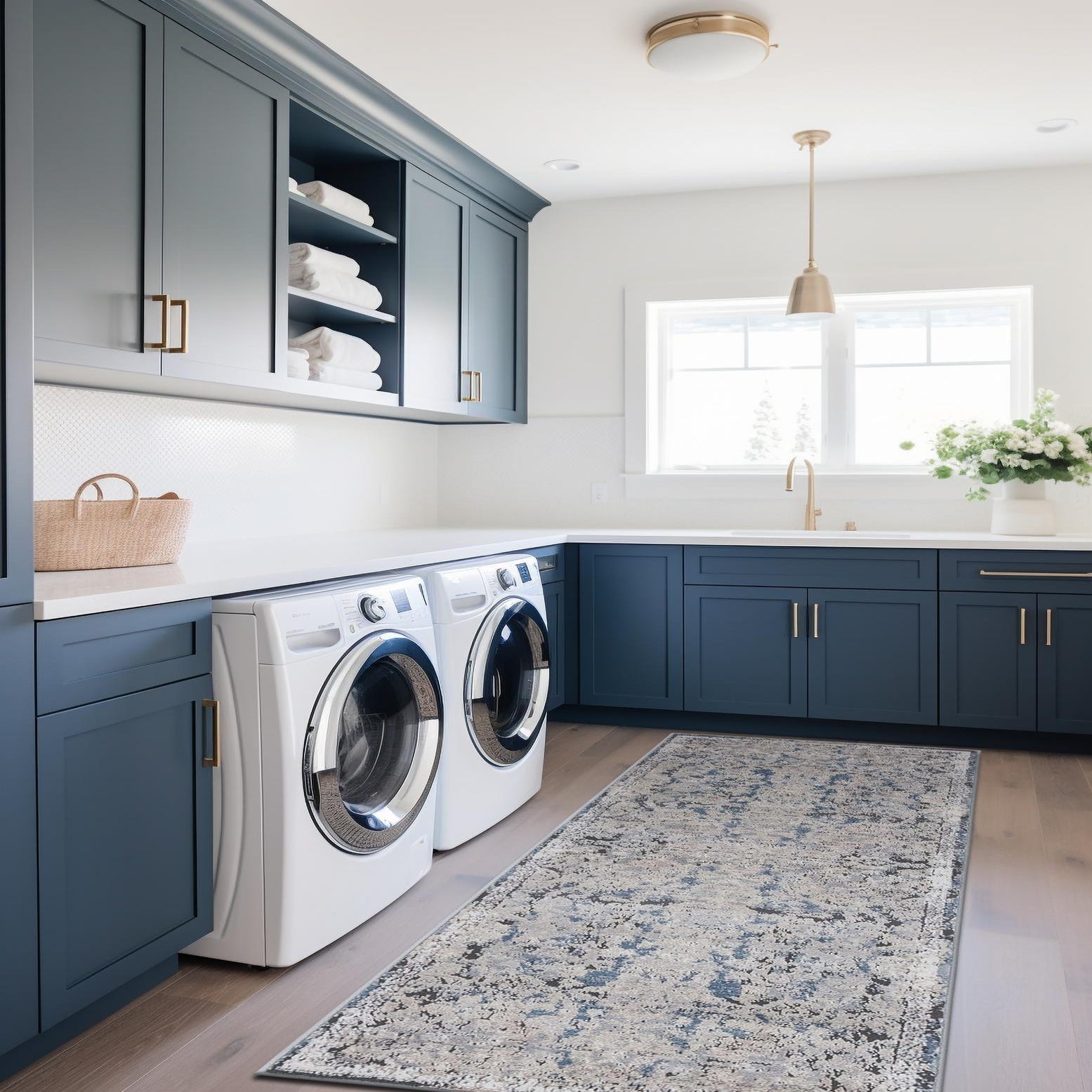 Primary color is Navy Blue. Colors in this rug include: Navy Blue, Beige, Gray, Ivory.