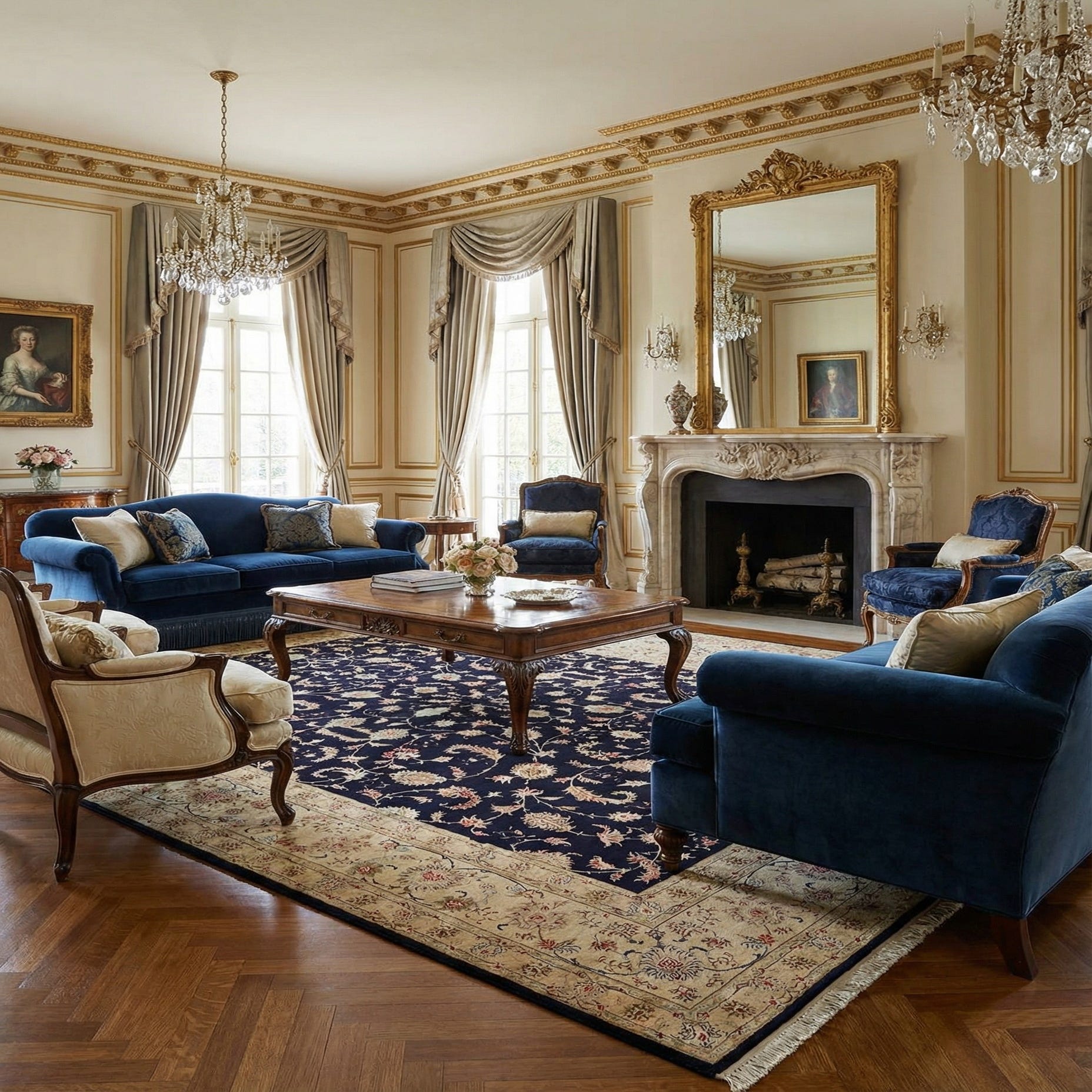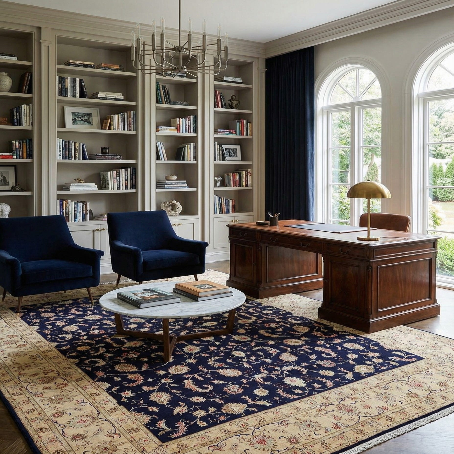 Primary color is Navy Blue. Colors in this rug include: Navy Blue, Gold, Green, Ivory, Olive, Red, Light Blue, Pink.