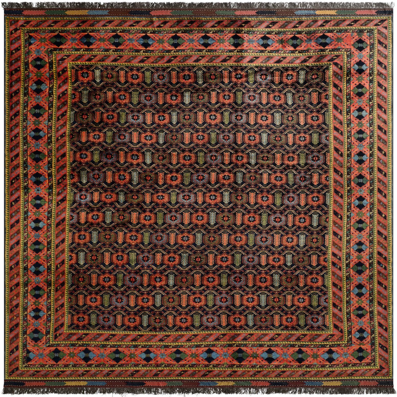 Primary color is Navy Blue. Colors in this rug include: Navy Blue, Beige, Brown, Green, Light Blue, Rust Red, Yellow.
