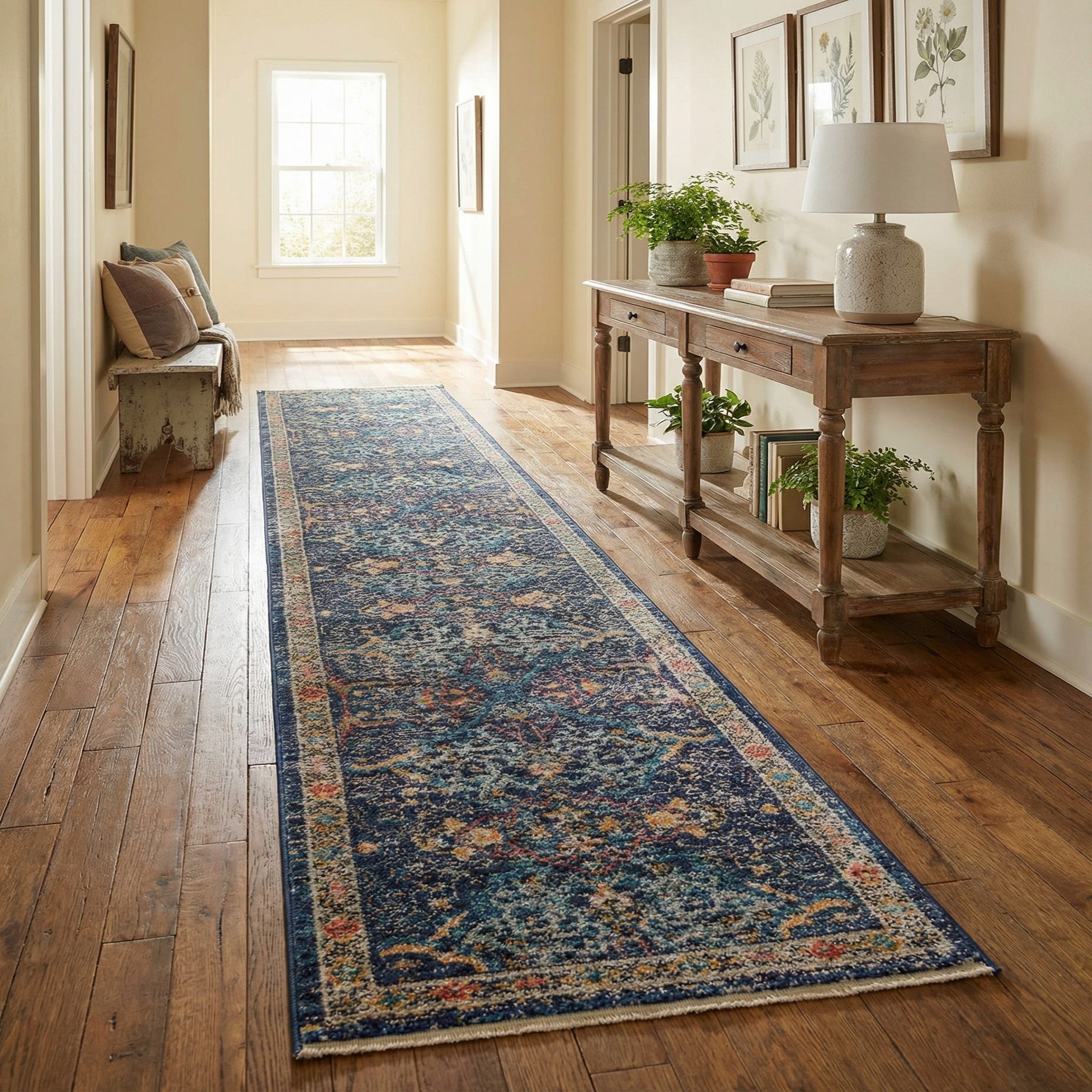 Primary color is Navy Blue. Colors in this rug include: Navy Blue, Brown, Light Blue, Orange, Red, Yellow, Ivory.
