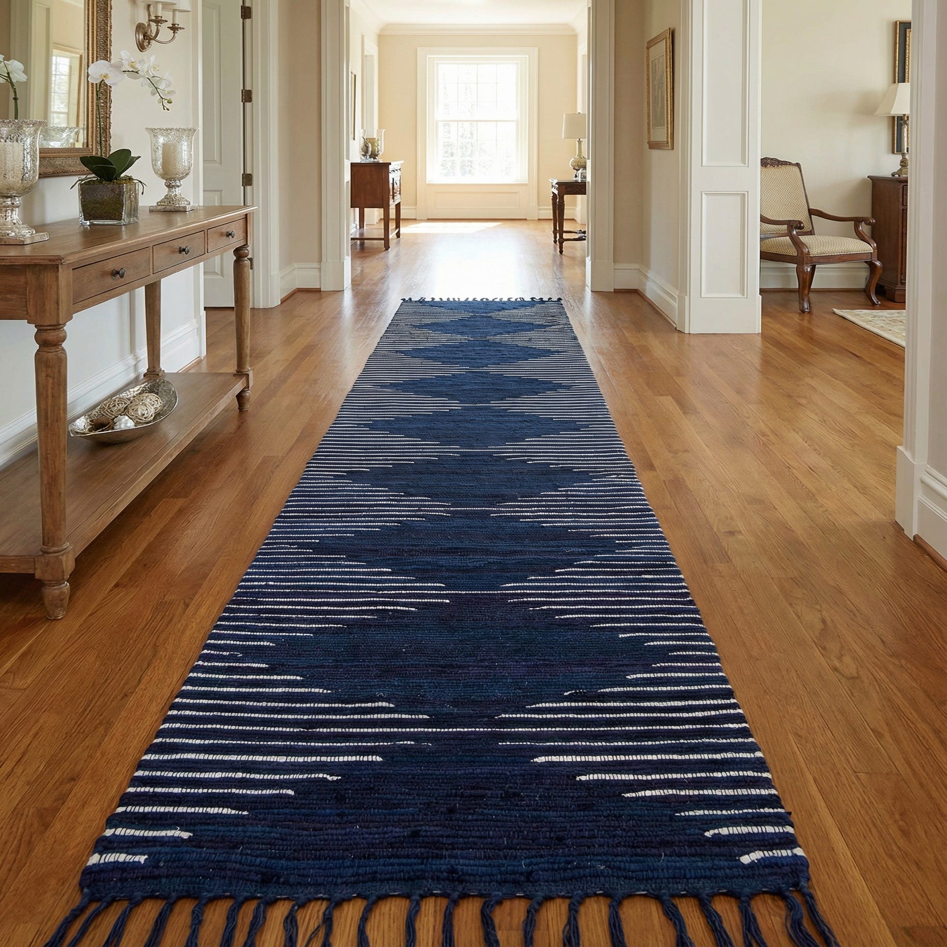 Primary color is Navy Blue. Colors in this rug include: Navy Blue, Ivory.