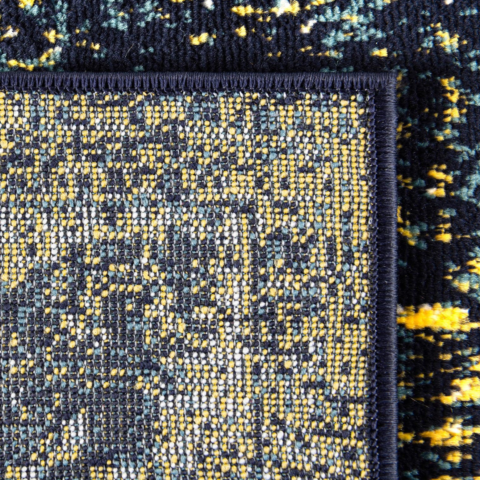 Primary color is Navy Blue. Colors in this rug include: Navy Blue, Ivory, Yellow.