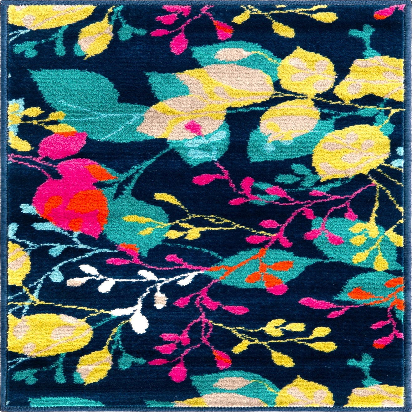 Primary color is Navy Blue. Colors in this rug include: Navy Blue, Blue, Ivory, Light Blue, Light Green, Orange, Turquoise, Violet.