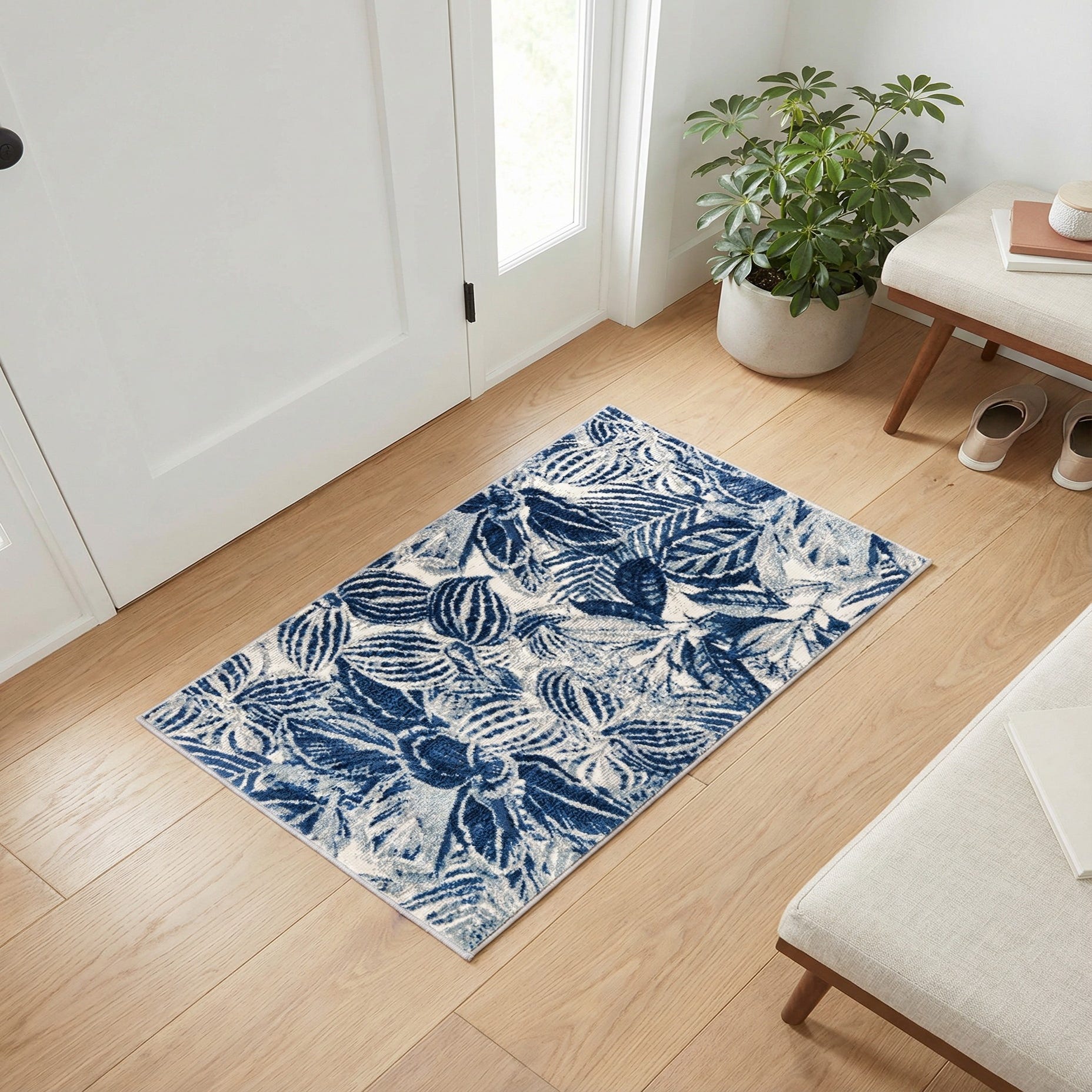 Primary color is Navy Blue. Colors in this rug include: Navy Blue, Ivory, Gray, Light Blue.