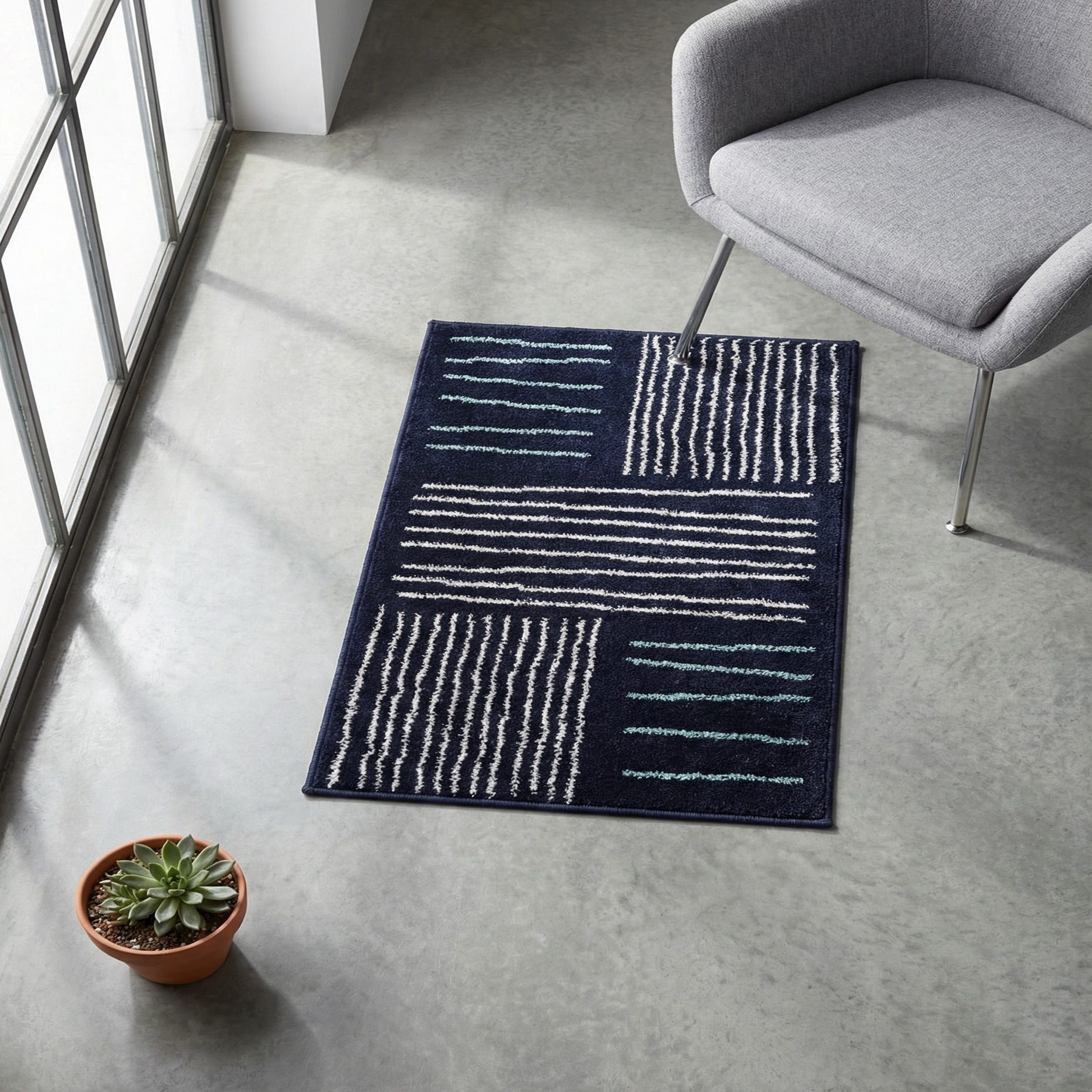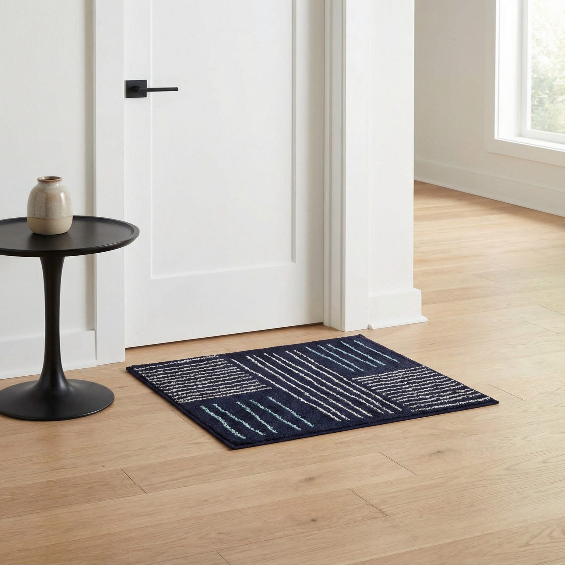 Primary color is Navy Blue. Colors in this rug include: Navy Blue, Ivory, Light Blue.