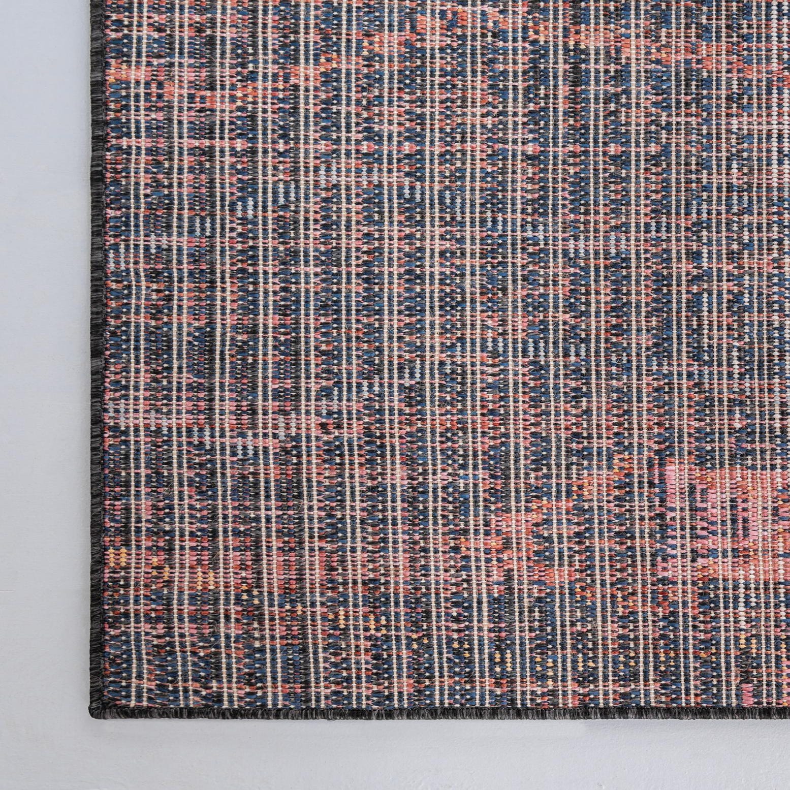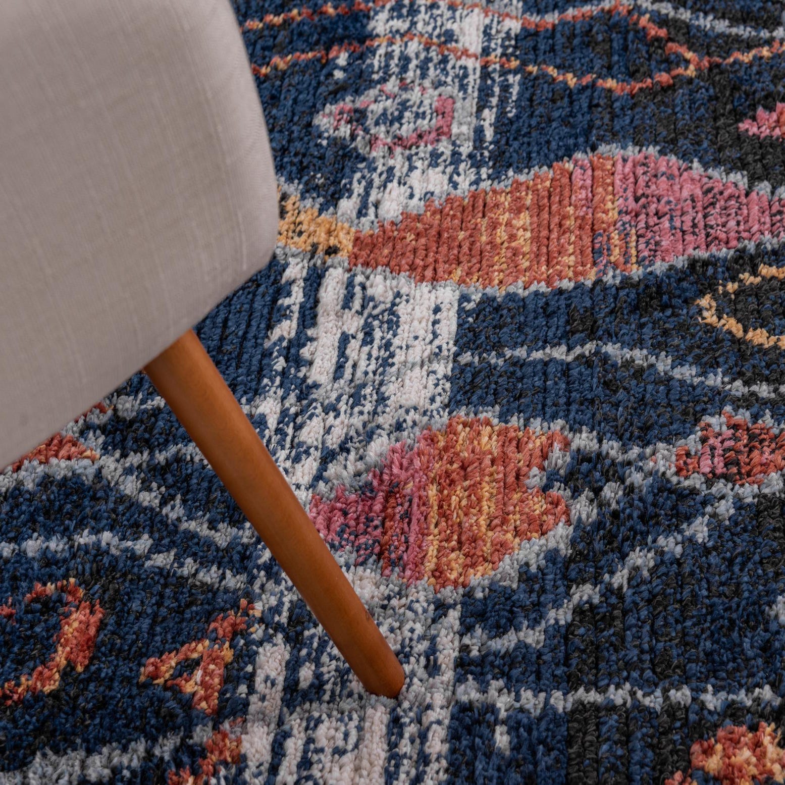 Primary color is Navy Blue. Colors in this rug include: Navy Blue, Black, Gray, Ivory, Light Blue, Rust Red, Yellow, Pink.