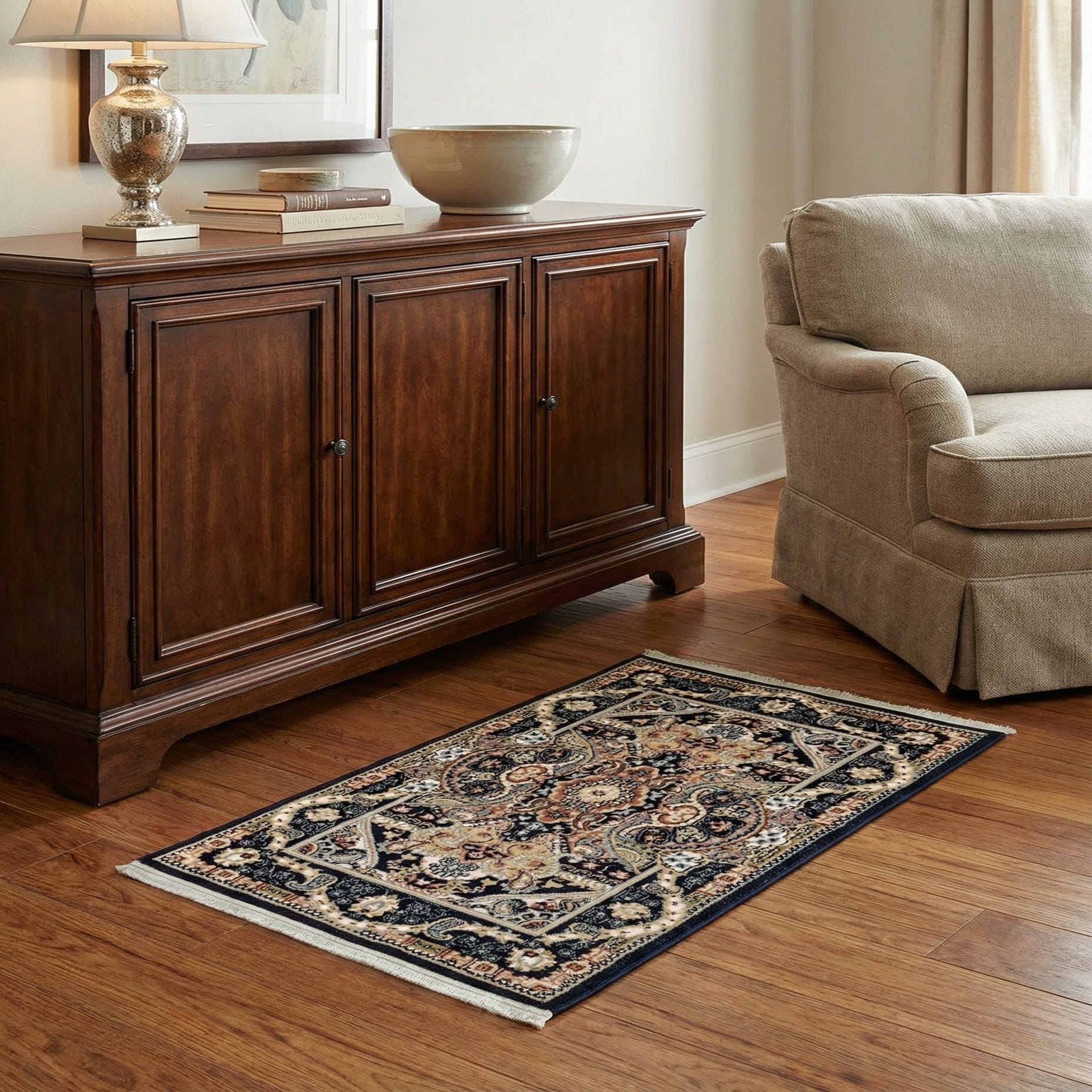 Primary color is Navy Blue. Colors in this rug include: Navy Blue, Blue, Burgundy, Cream, Green, Ivory, Plum Red, Tan.