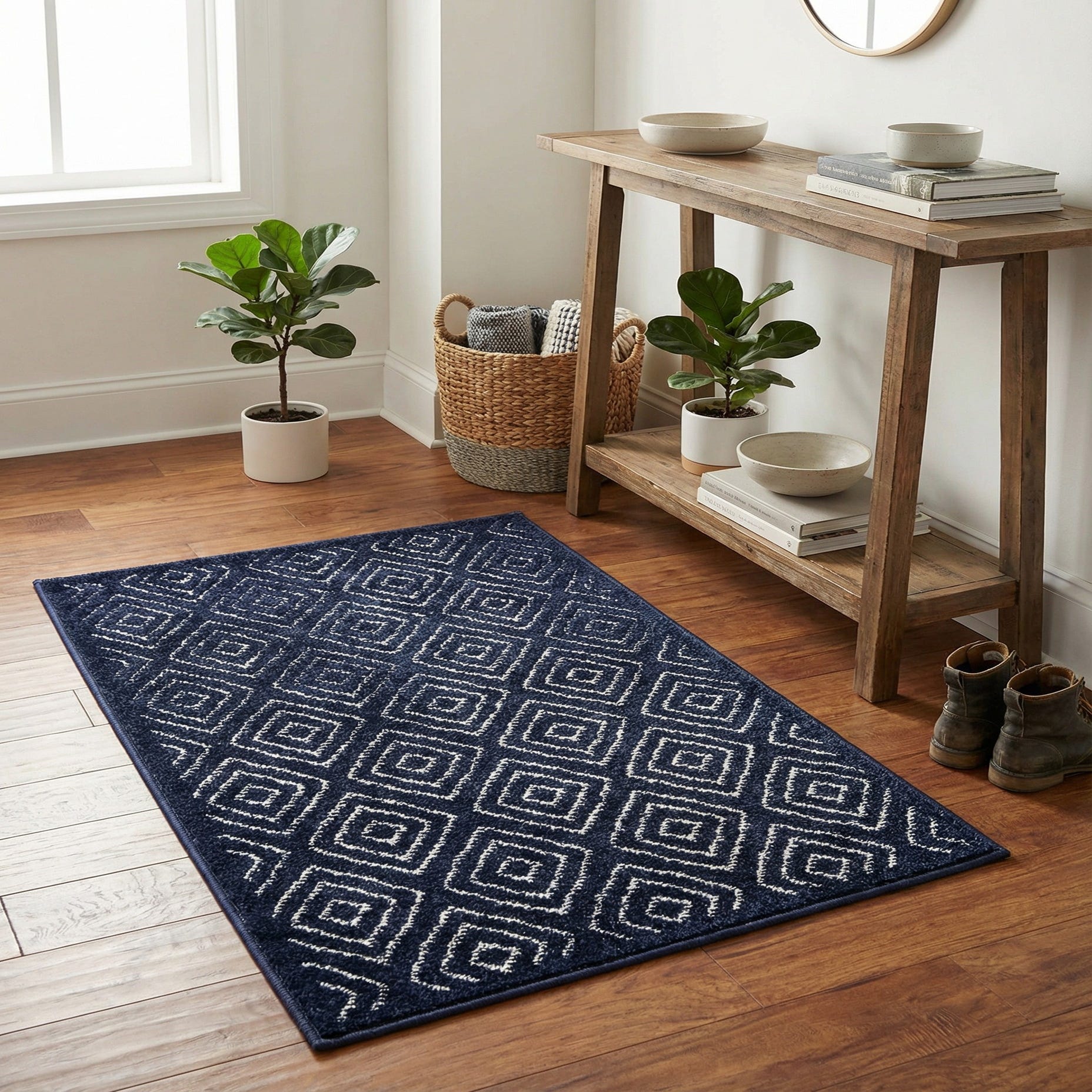 Primary color is Navy Blue. Colors in this rug include: Navy Blue, Ivory.