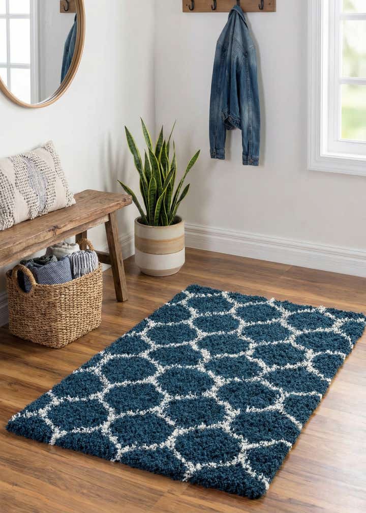 Primary color is Navy Blue. Colors in this rug include: Navy Blue, Ivory.